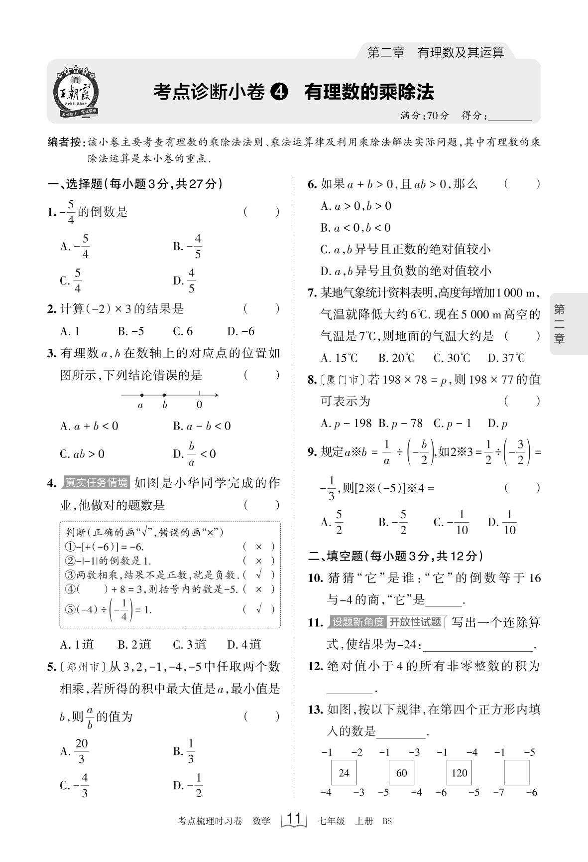 2023上册七年级数学北师版 考点诊断小卷4 有理数的乘除法