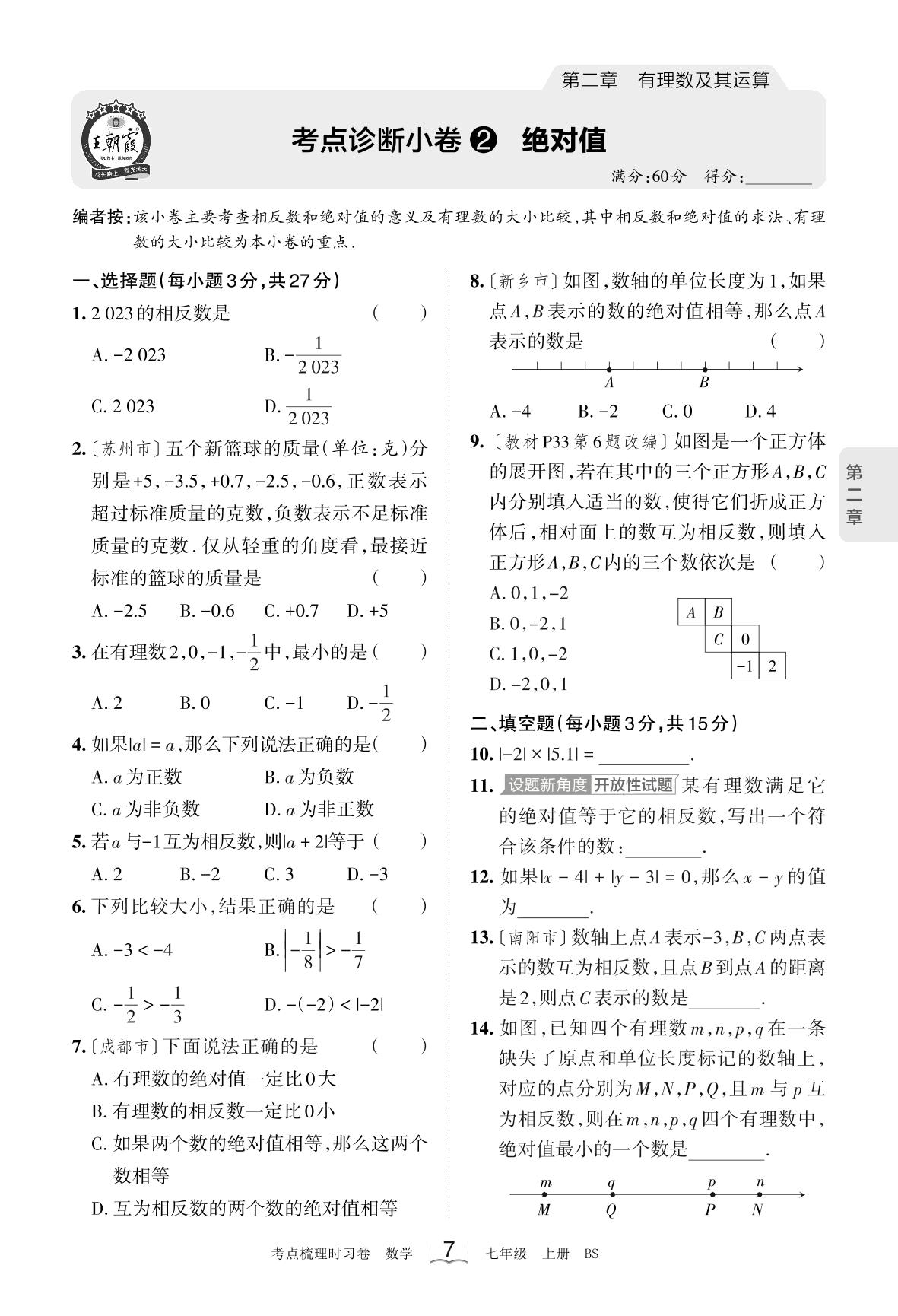 2023上册七年级数学北师版 考点诊断小卷2 绝对值