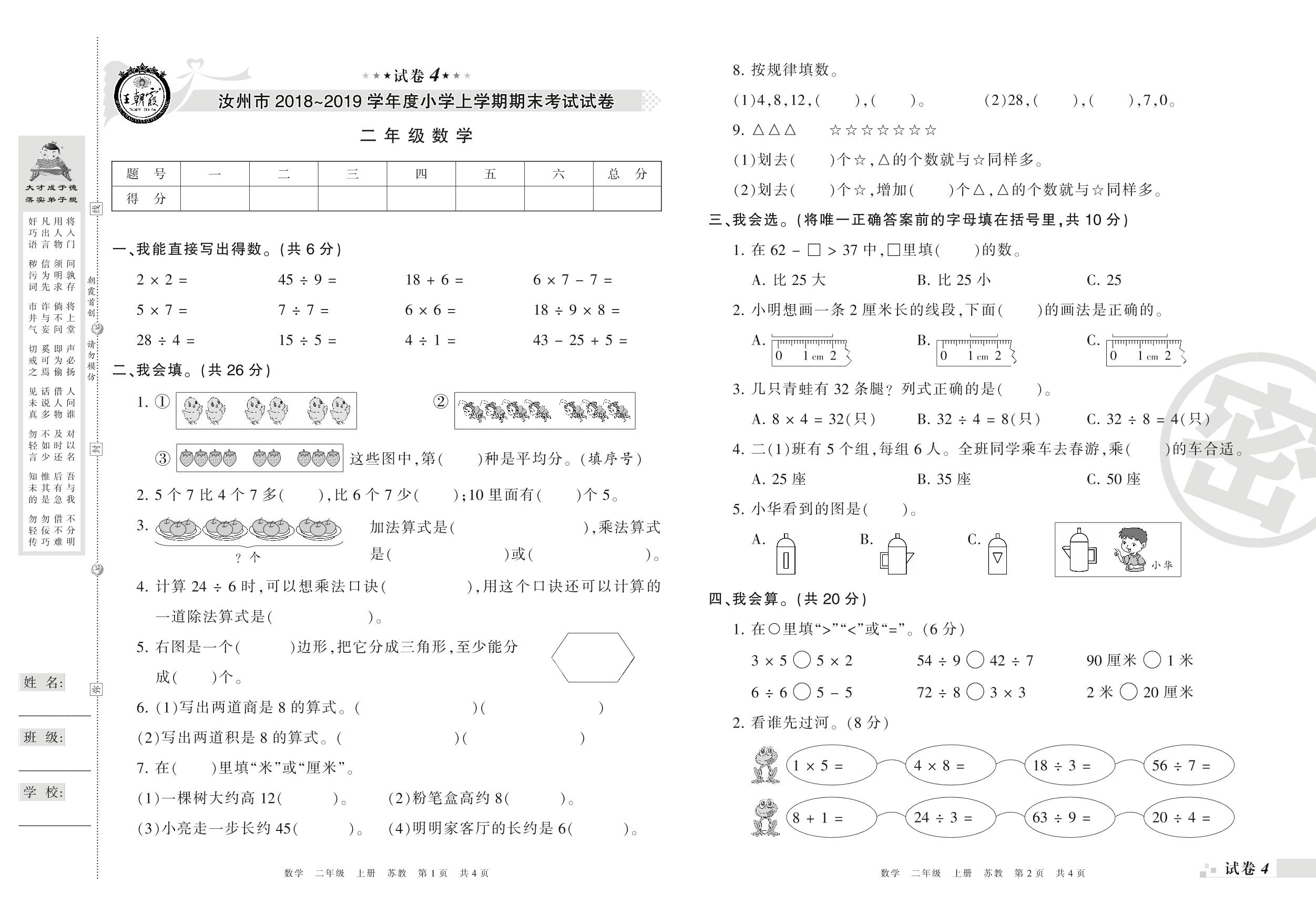 2018-2019学年第一学期汝州市二年级数学试卷(苏教版)【4】