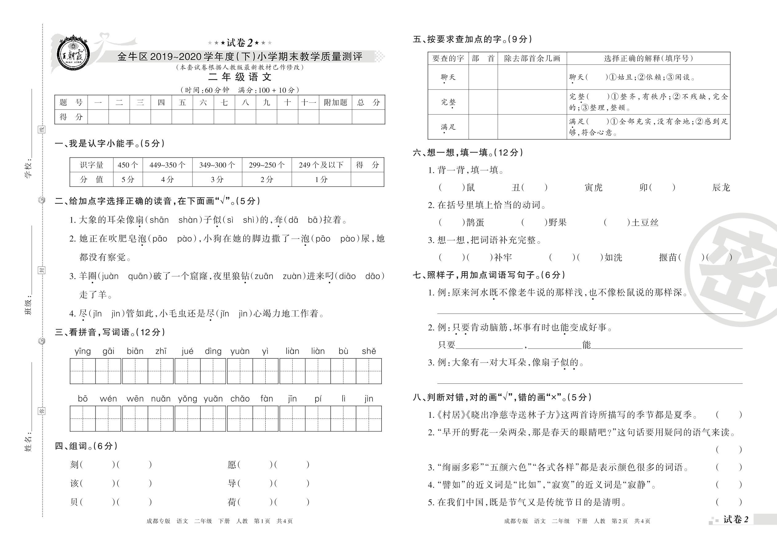 2019-2020学年第二学期成都市金牛区二年级语文试卷(人教版)【2】