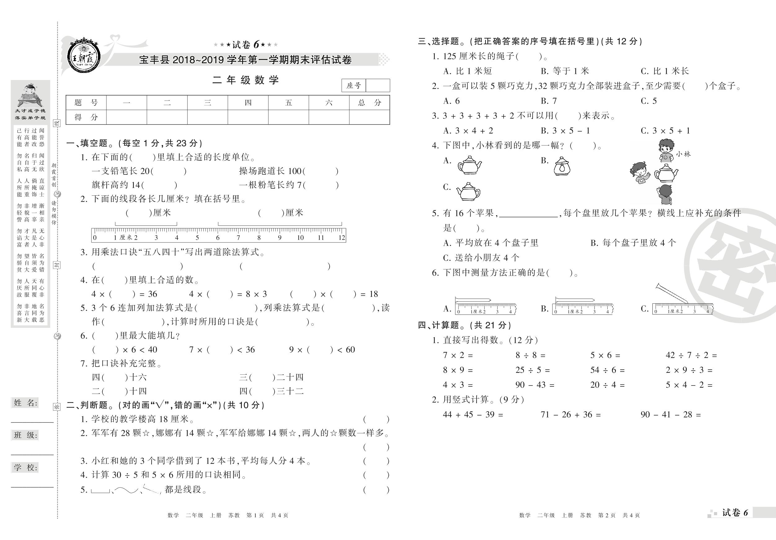 2018-2019学年第一学期平顶山市宝丰县二年级数学试卷(苏教版)【6】