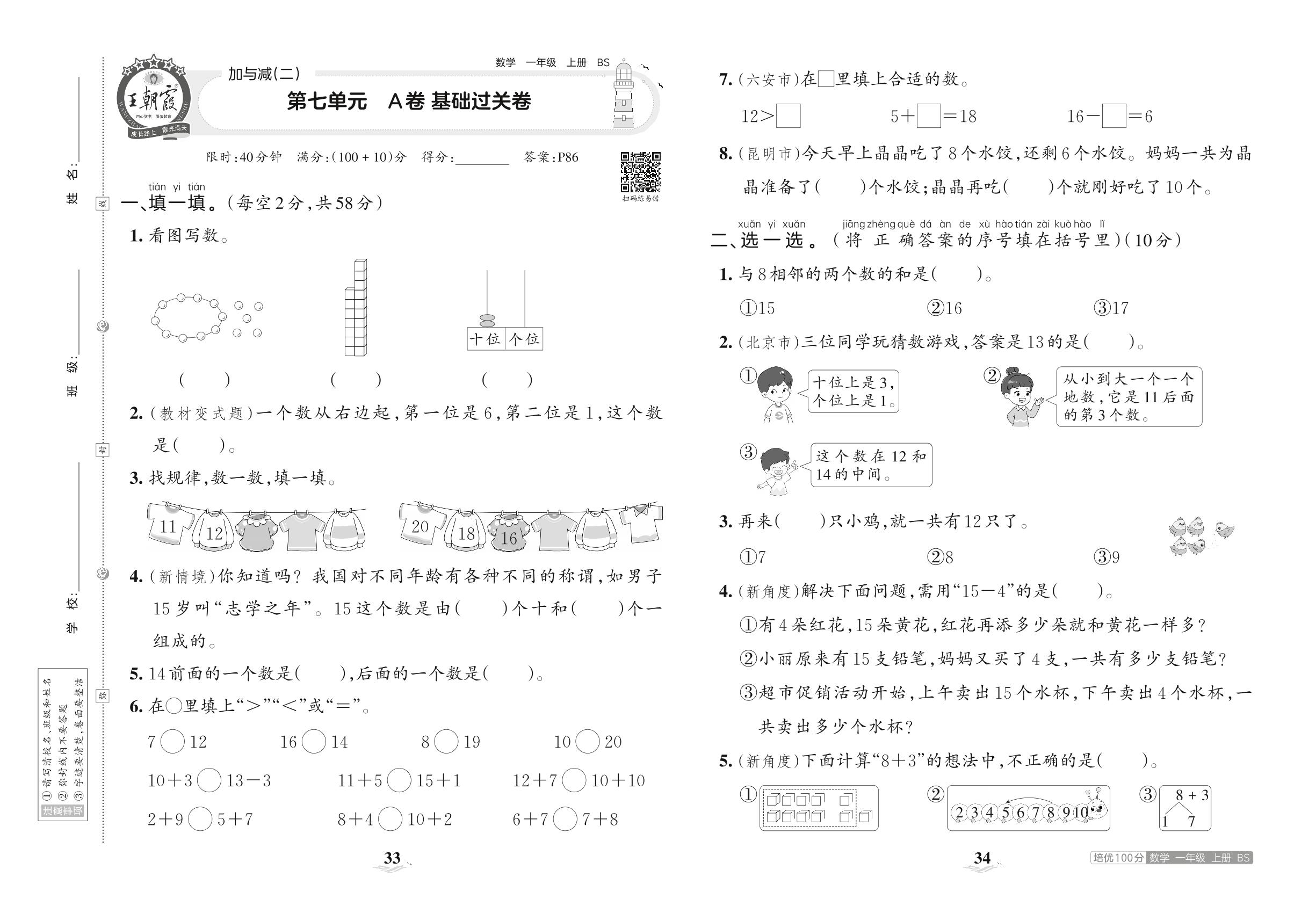 2023上册一年级数学北师版 第七单元 A卷 基础过关卷