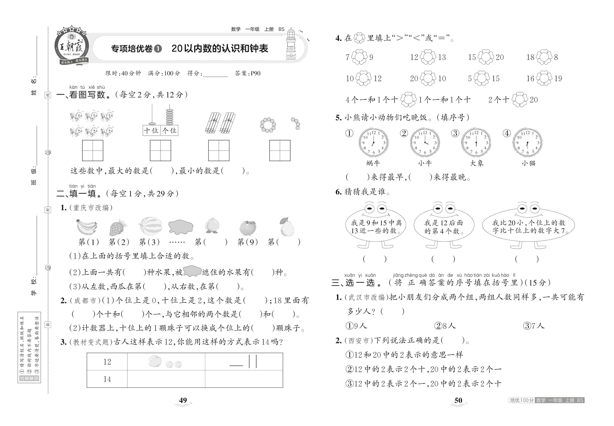 2023上册一年级数学北师版 专项培优卷1 20以内数的认识和钟表