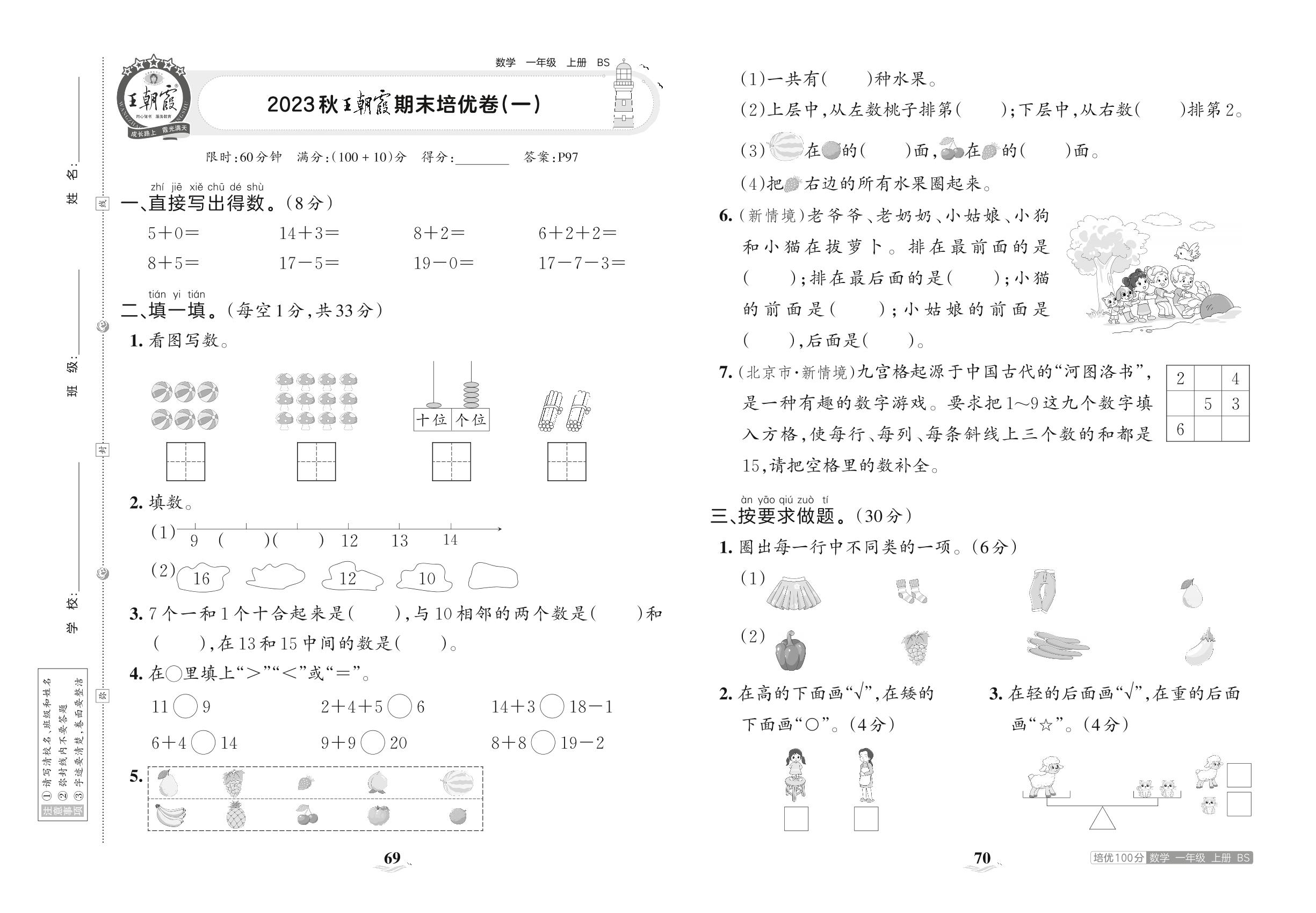 2023上册一年级数学北师版 2023秋王朝霞期末培优卷(一)