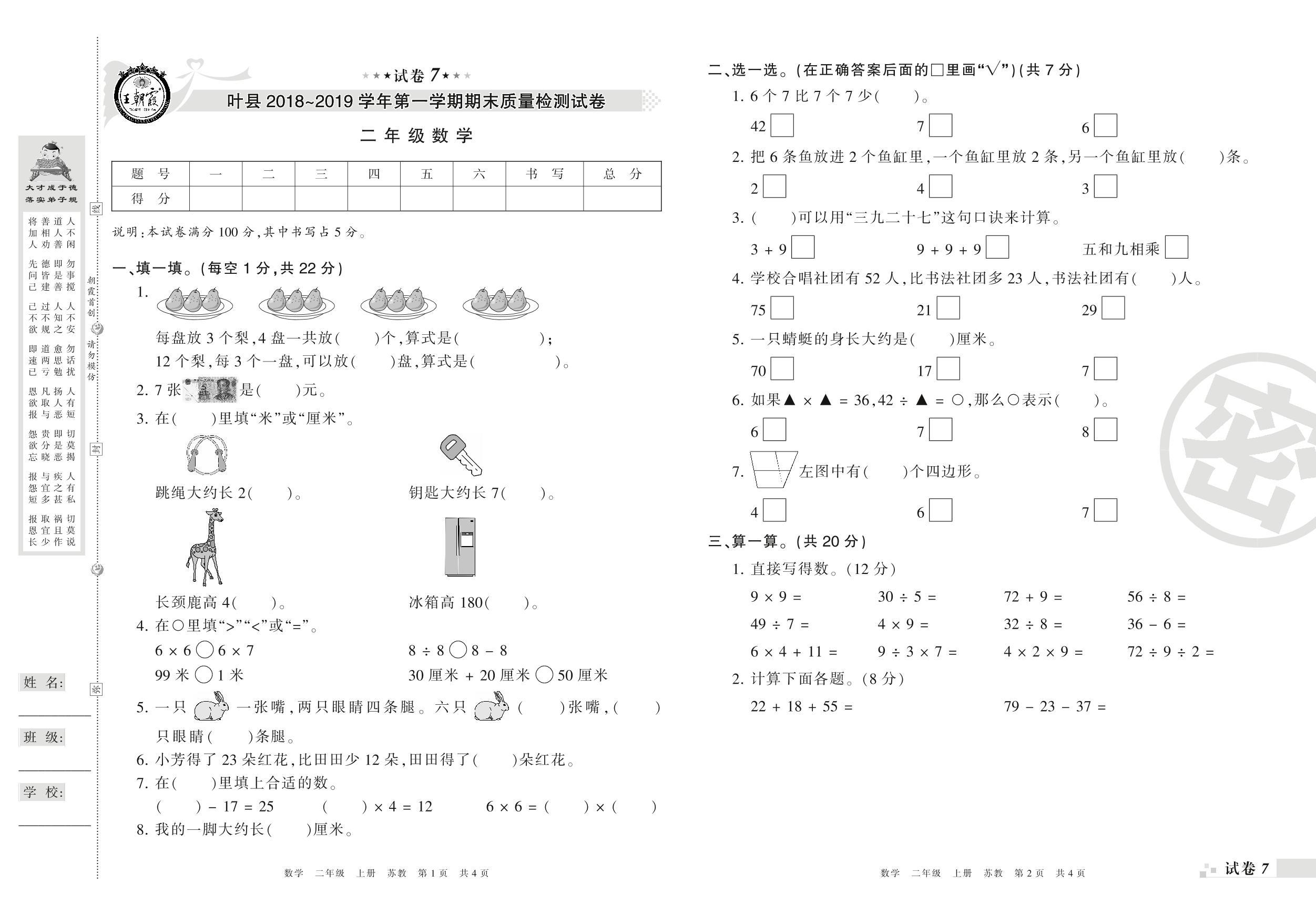 2018-2019学年第一学期平顶山市叶县二年级数学试卷(苏教版)【7】