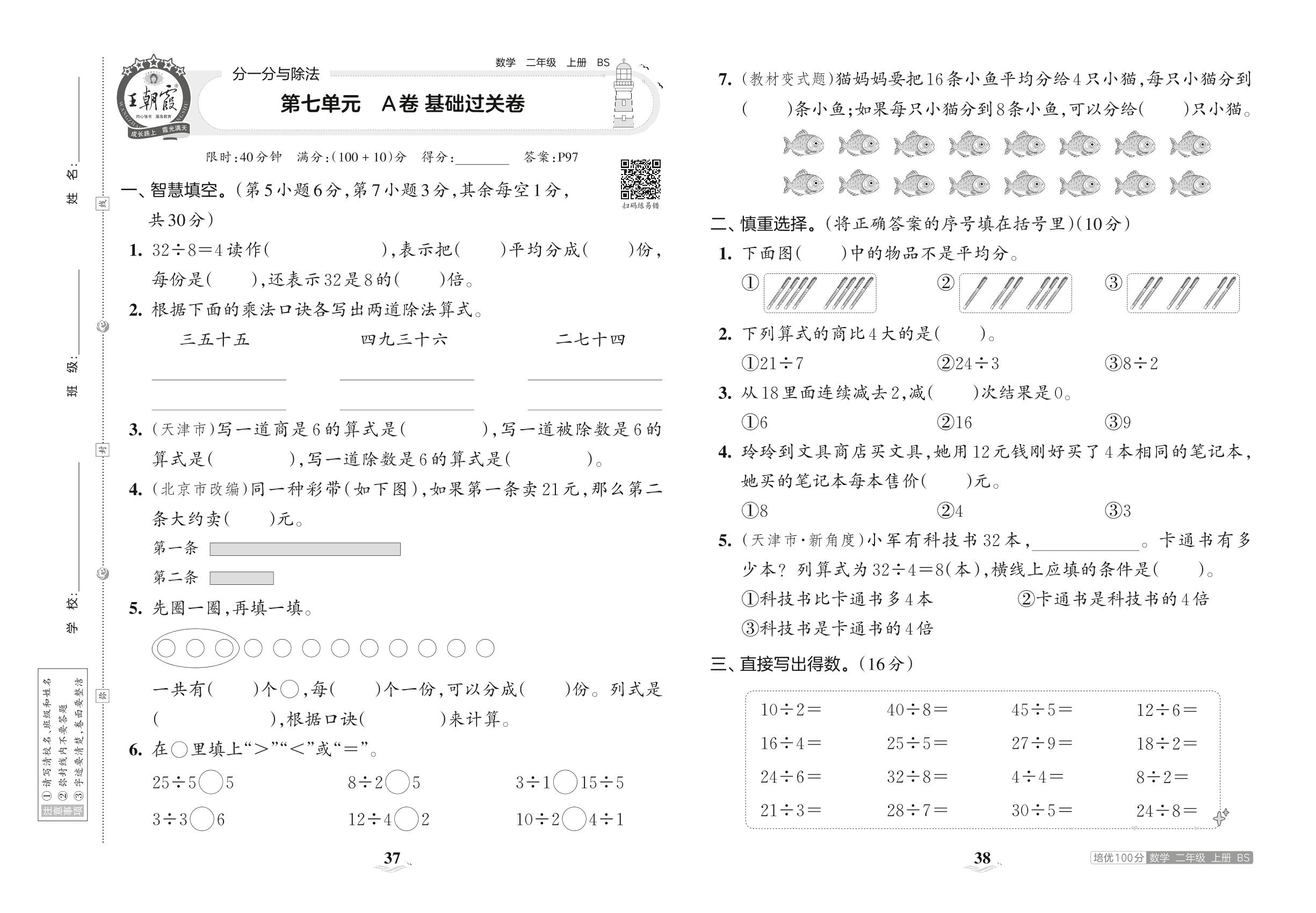 2023上册二年级数学北师版 第七单元 A卷 基础过关卷