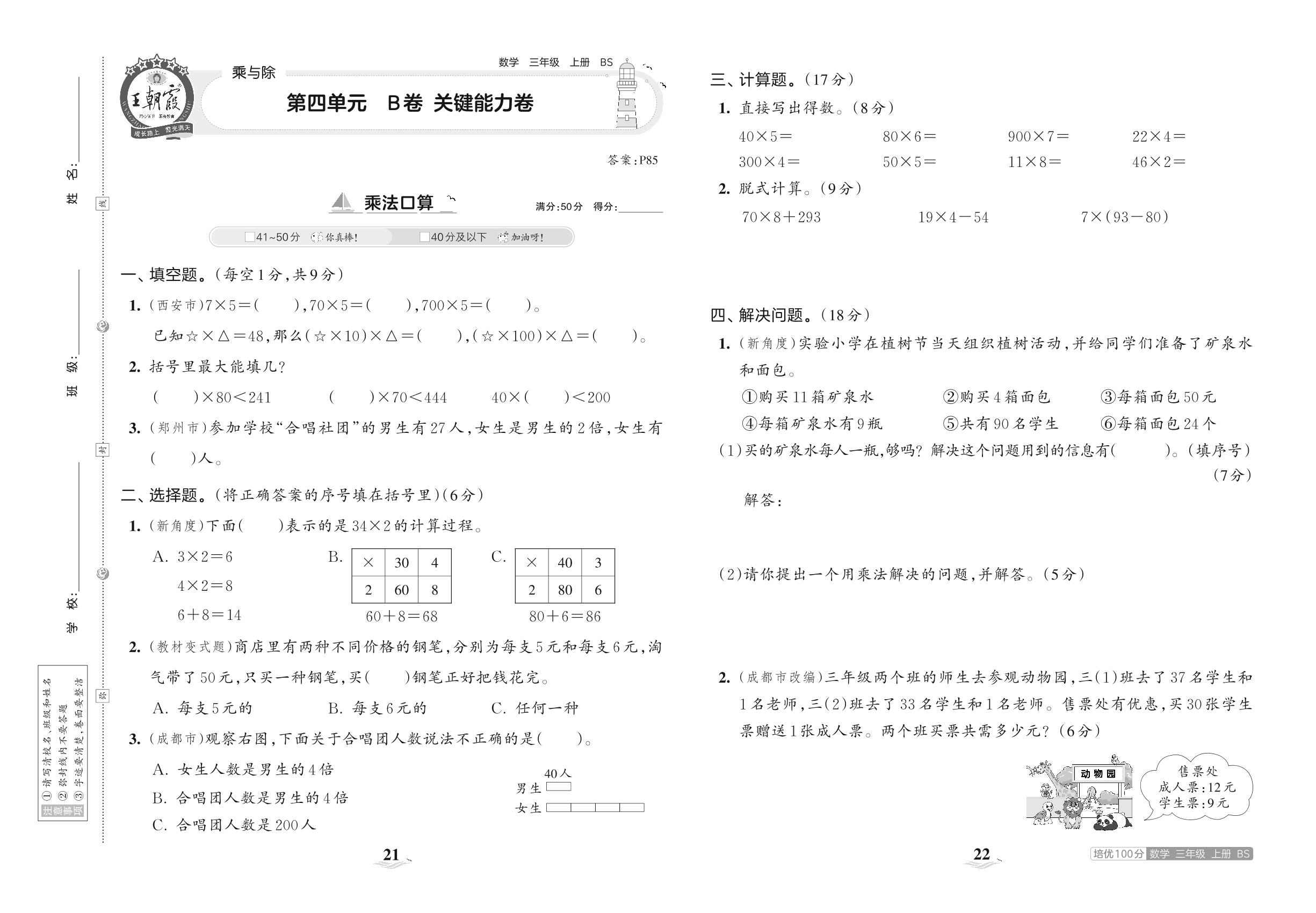 2023上册三年级数学北师版 第四单元 B卷 关键能力卷