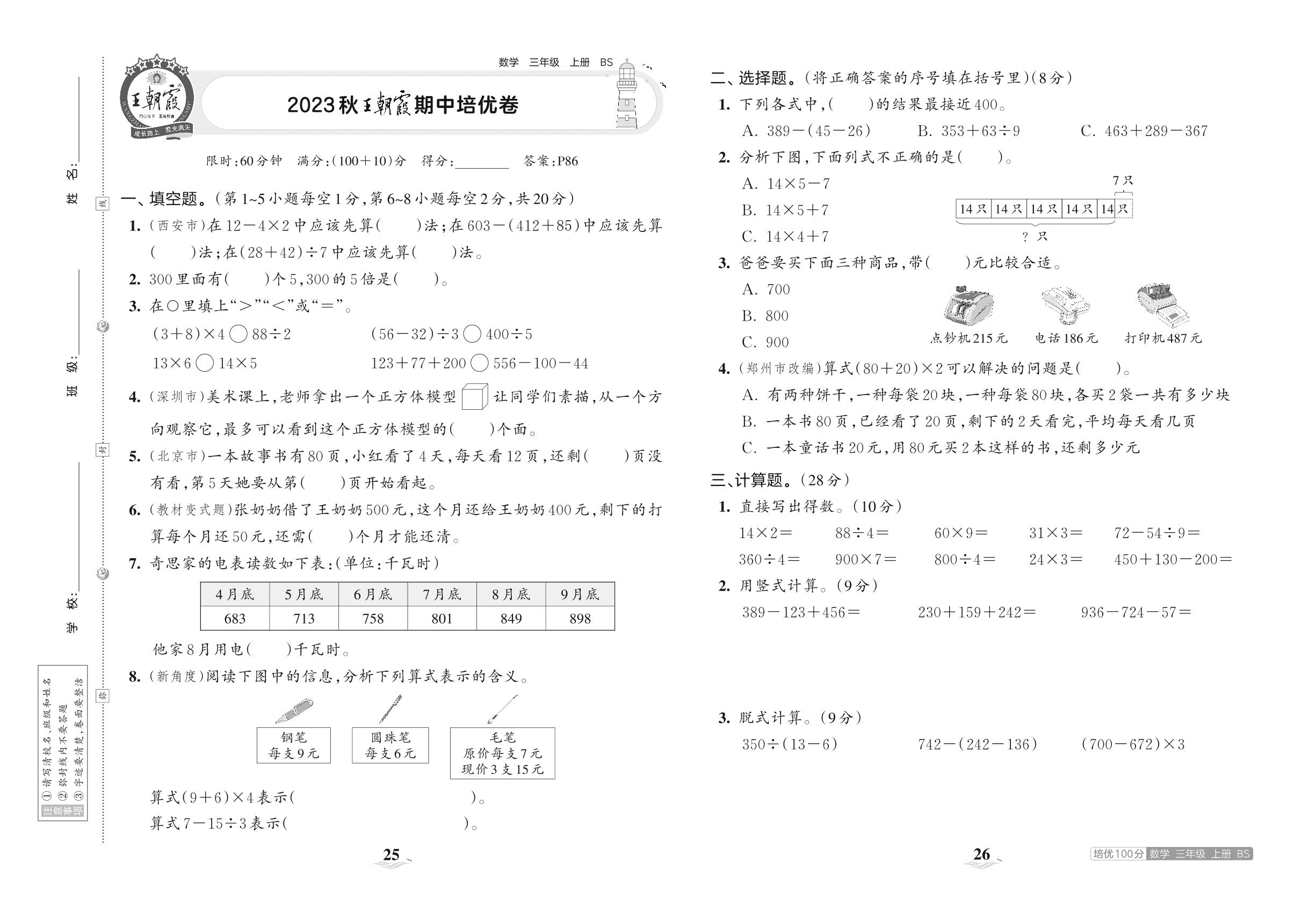 2023上册三年级数学北师版 2023秋王朝霞期中培优卷