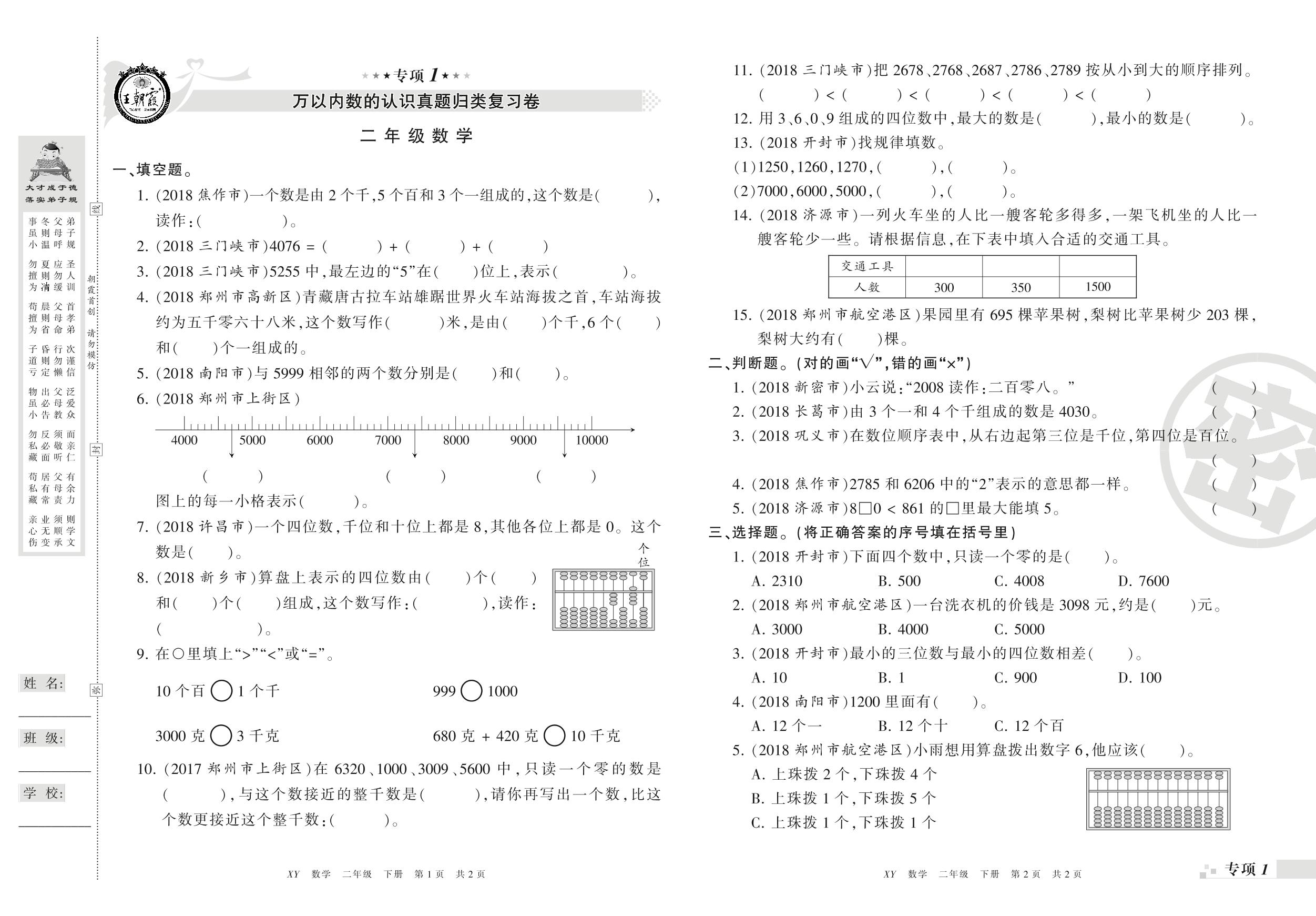 王朝霞期末专项卷——万以内数的认识、计算(一)真题归类复习卷二年级下册数学(人教版)_R21080393555【0】