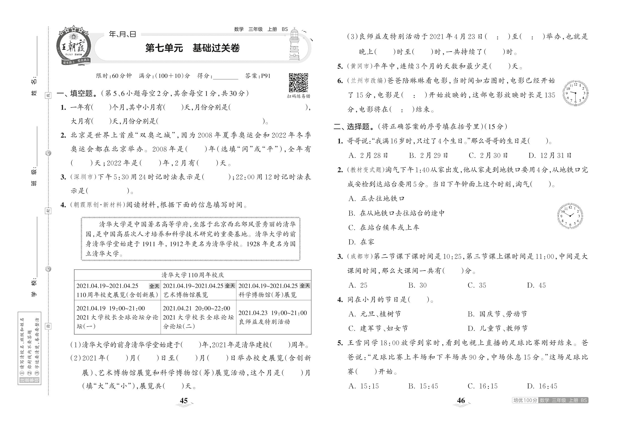 2023上册三年级数学北师版 第七单元 基础过关卷
