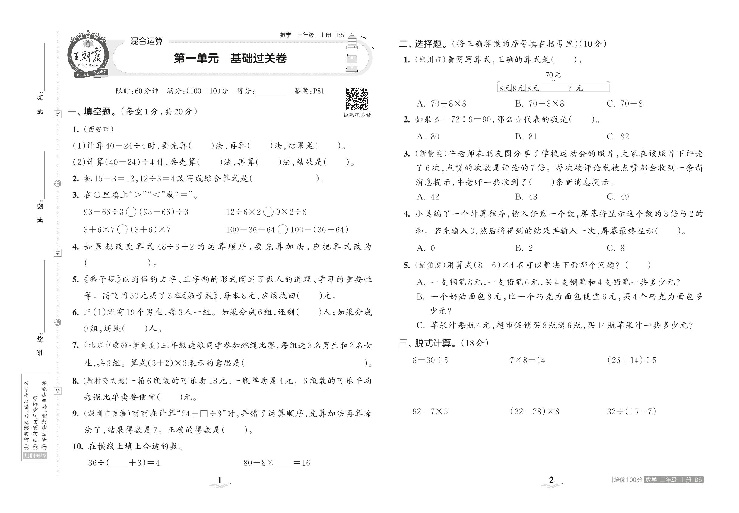 2023上册三年级数学北师版 第一单元 基础过关卷