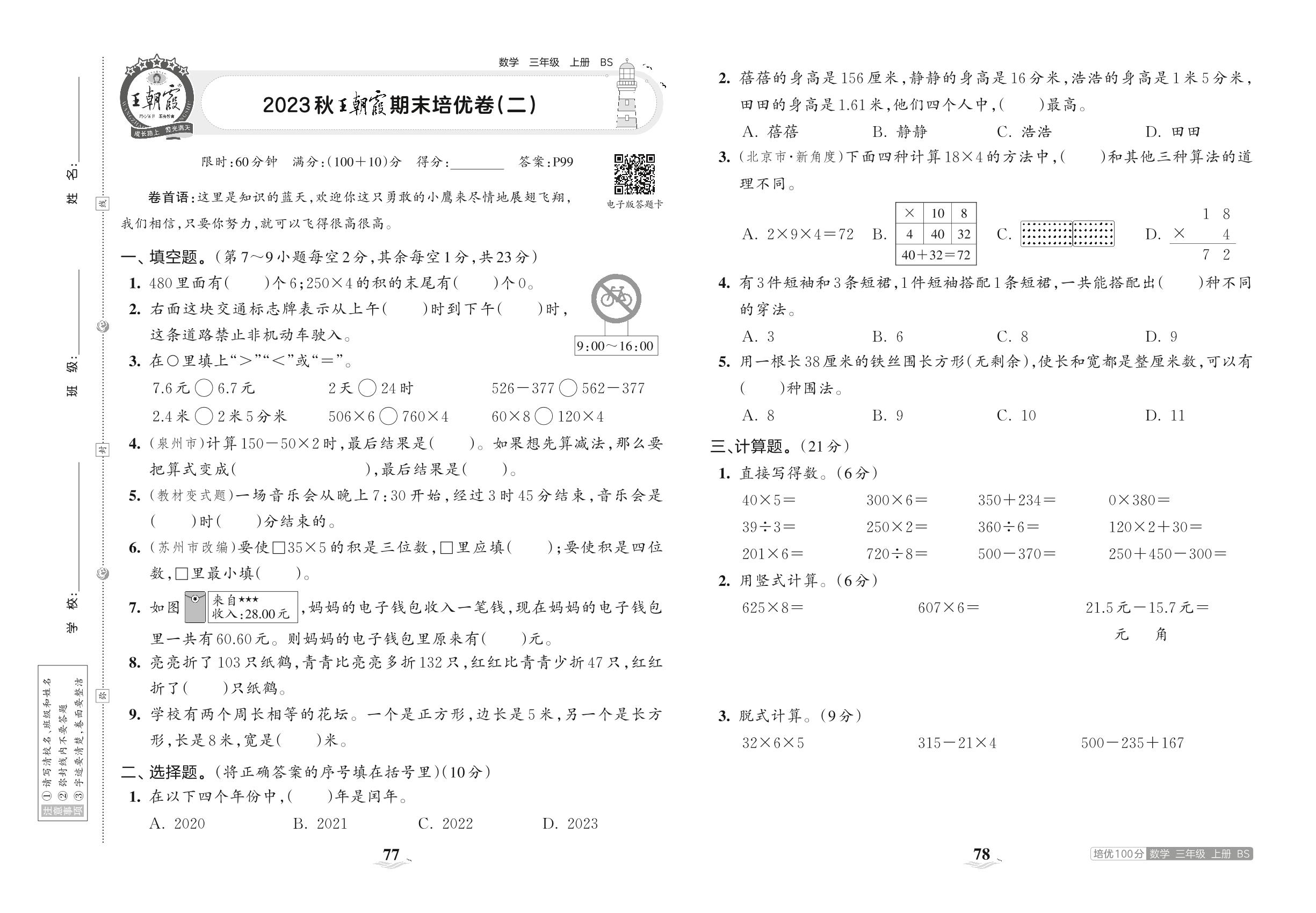 2023上册三年级数学北师版 2023秋王朝霞期末培优卷(二)