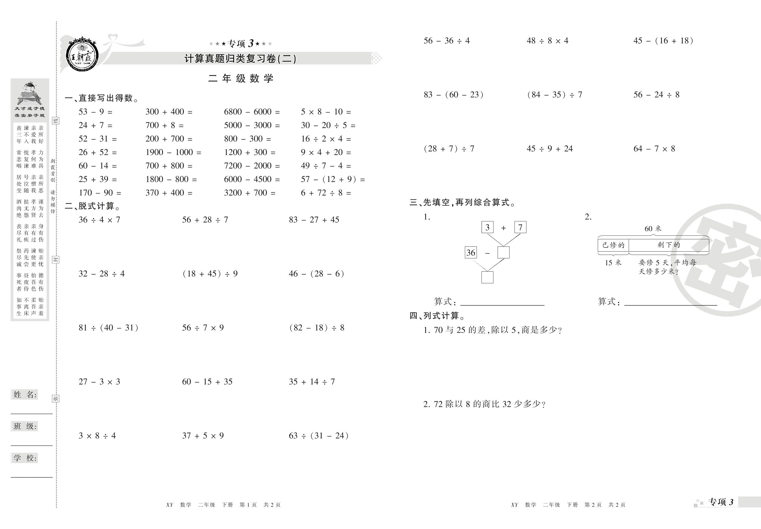王朝霞期末专项卷——计算(二)、解决问题真题归类复习卷二年级下册数学(人教版)_R21080393559【0】