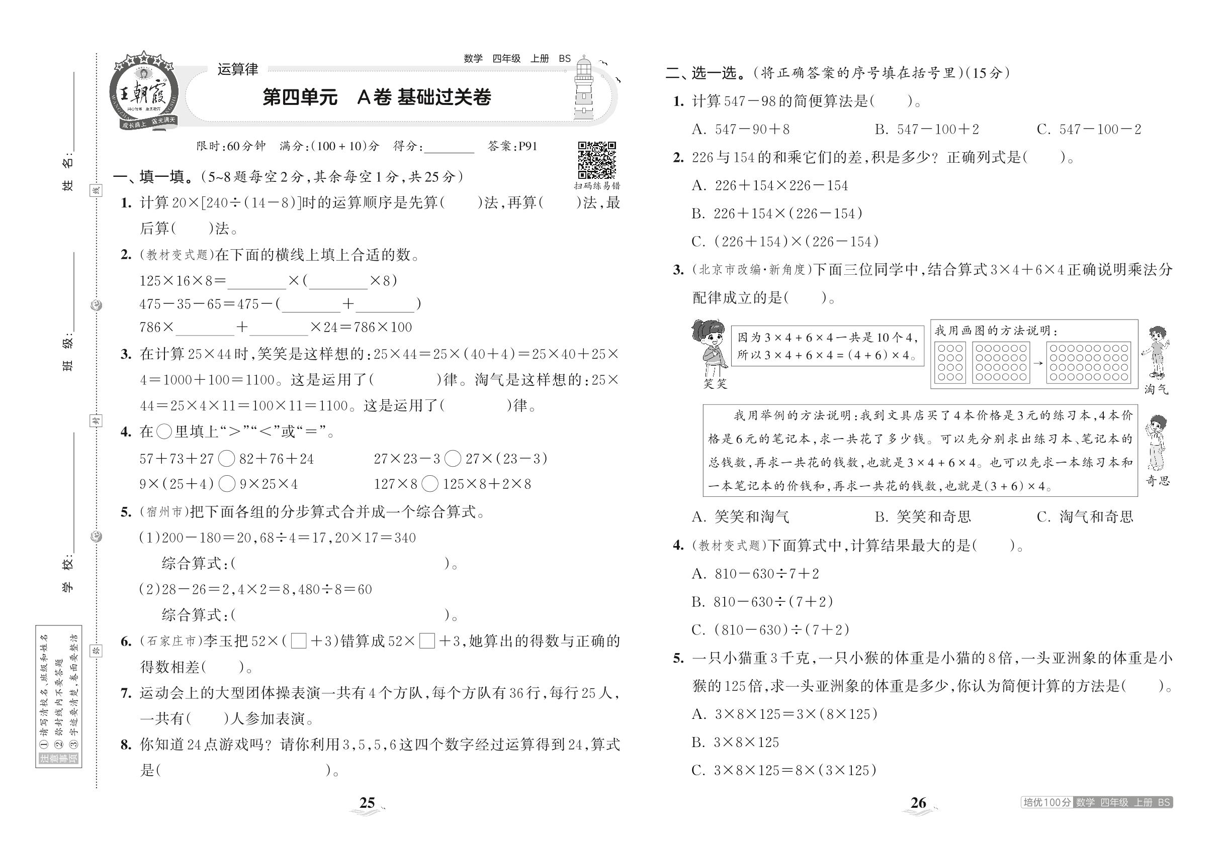 2023上册四年级数学北师版 第四单元 A卷 基础过关卷
