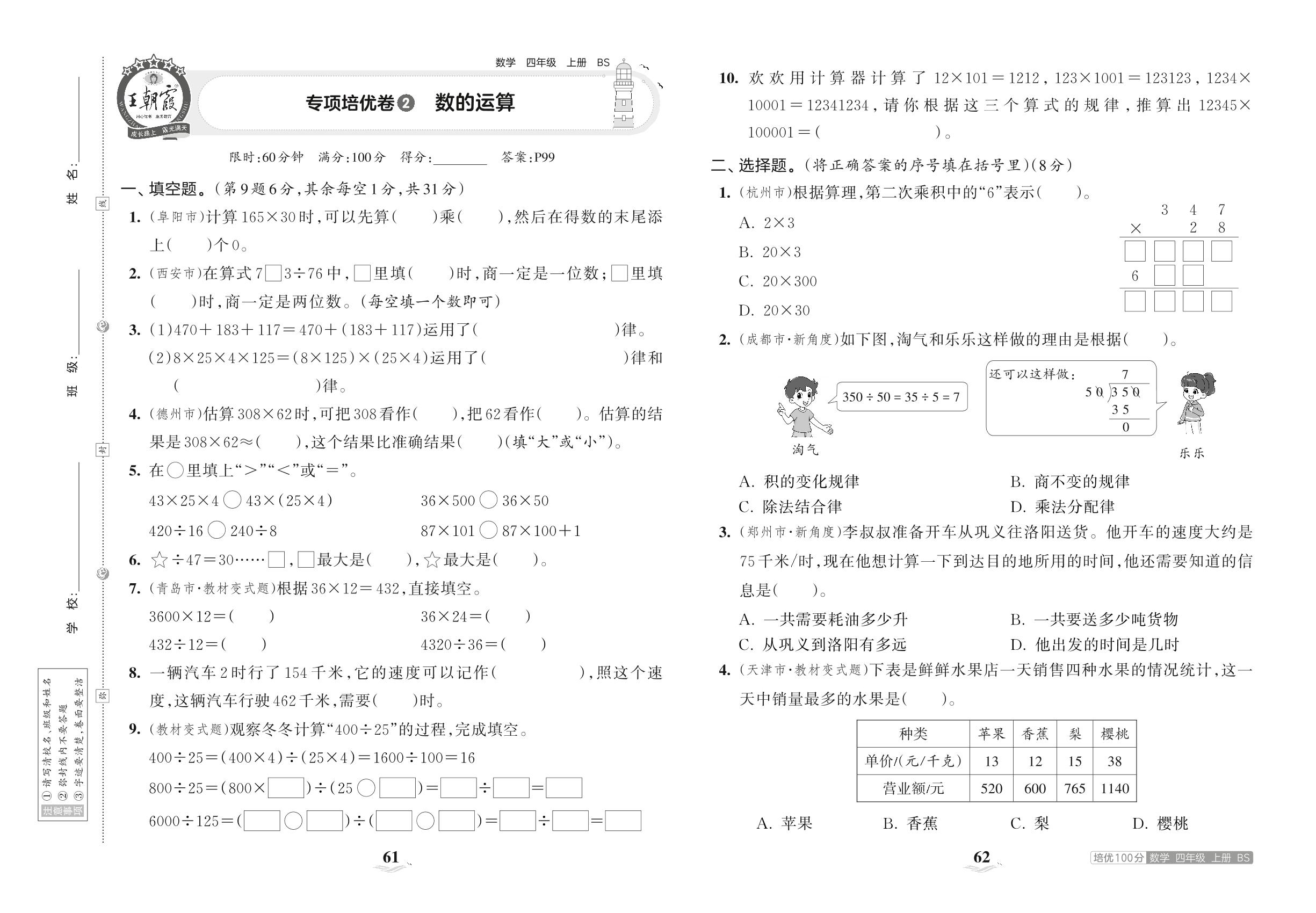 2023上册四年级数学北师版 专项培优卷2 数的运算