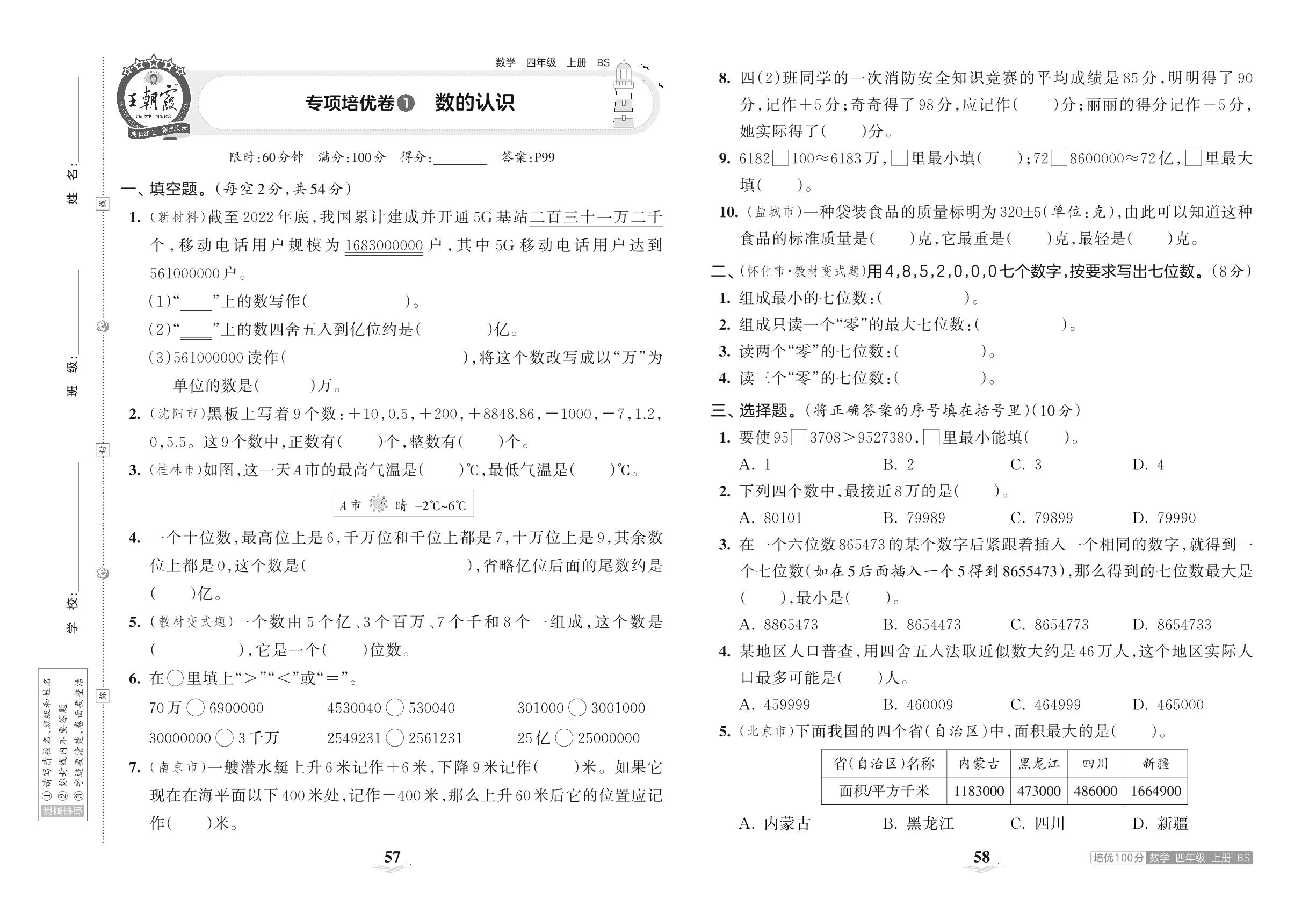 2023上册四年级数学北师版 专项培优卷1 数的认识