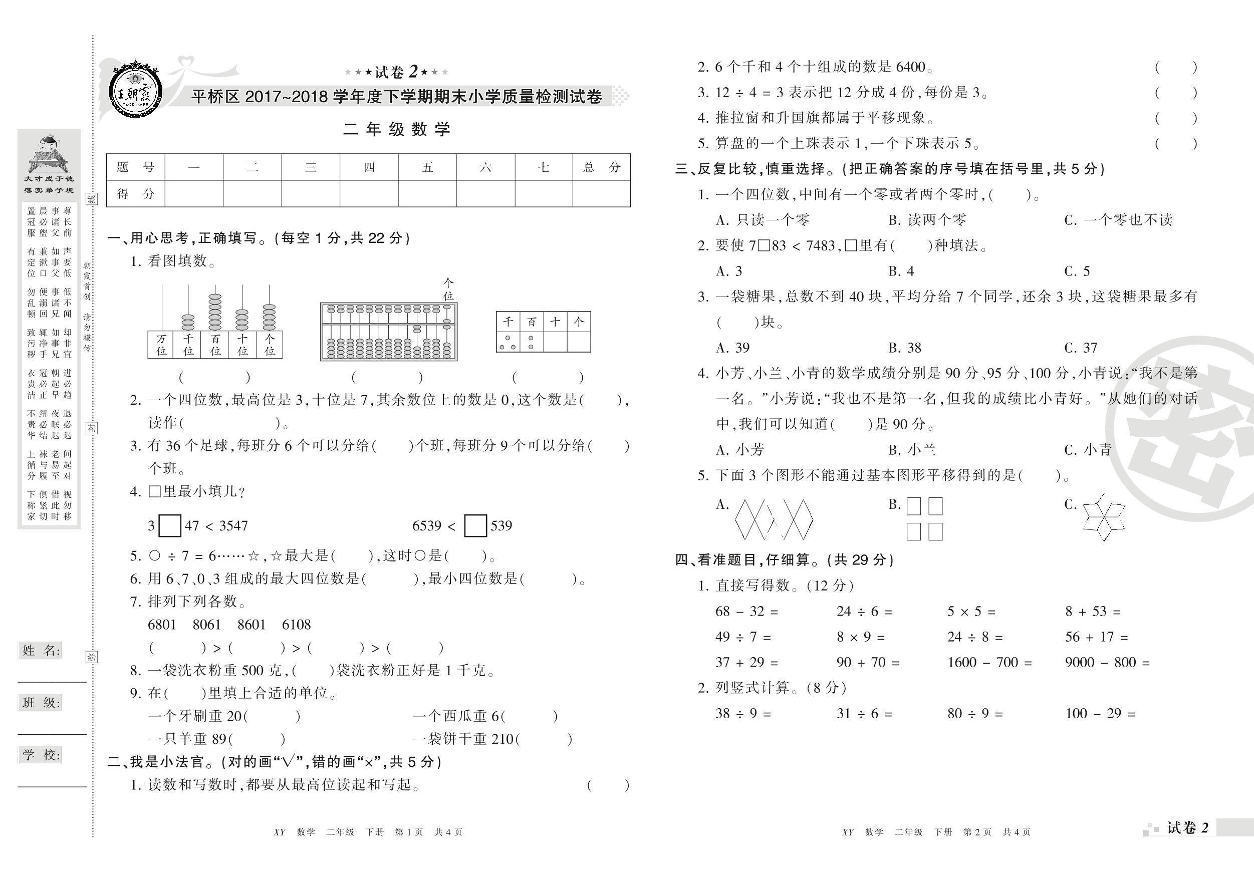 2017-2018学年第二学期信阳市平桥区二年级数学试卷(人教版)【2】