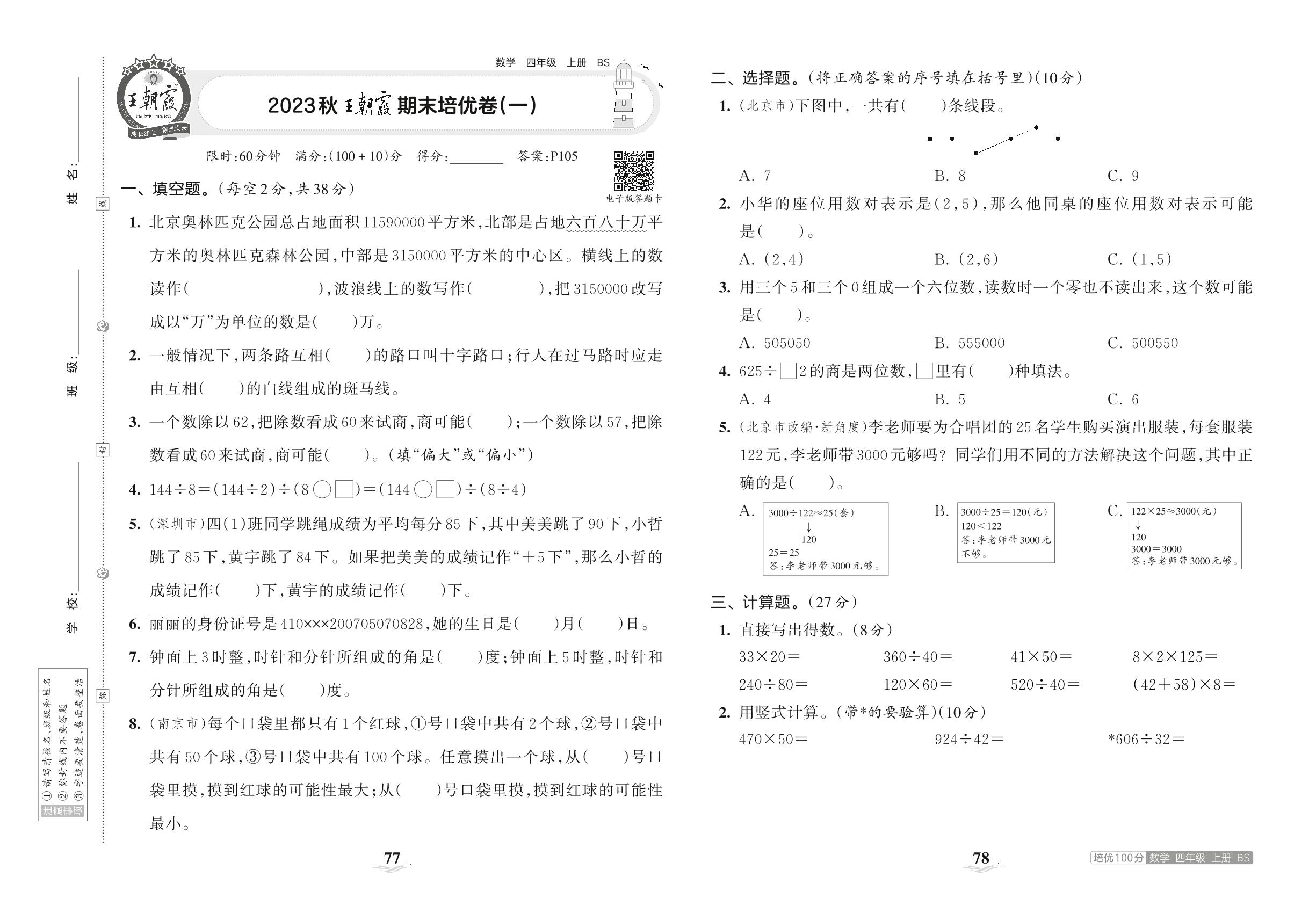 2023上册四年级数学北师版 2023秋王朝霞期末培优卷(一)