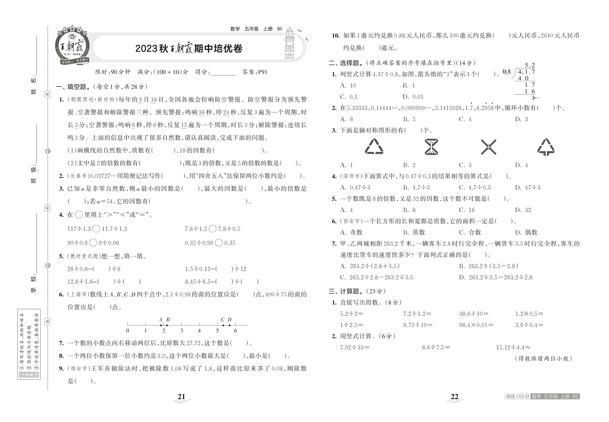 2023上册五年级数学北师版 2023秋王朝霞期中培优卷