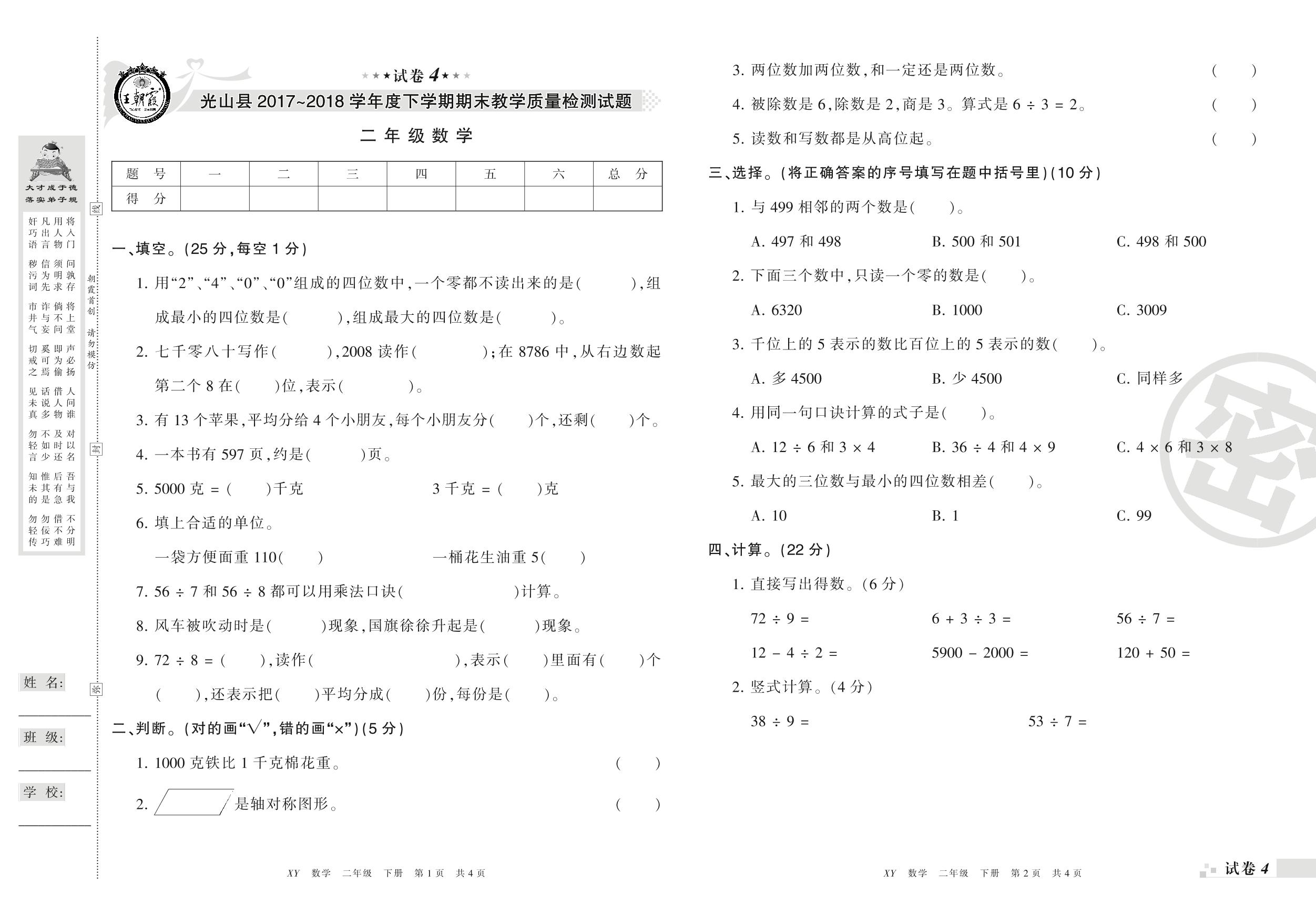 2017-2018学年第二学期信阳市光山县二年级数学试卷(人教版)【4】
