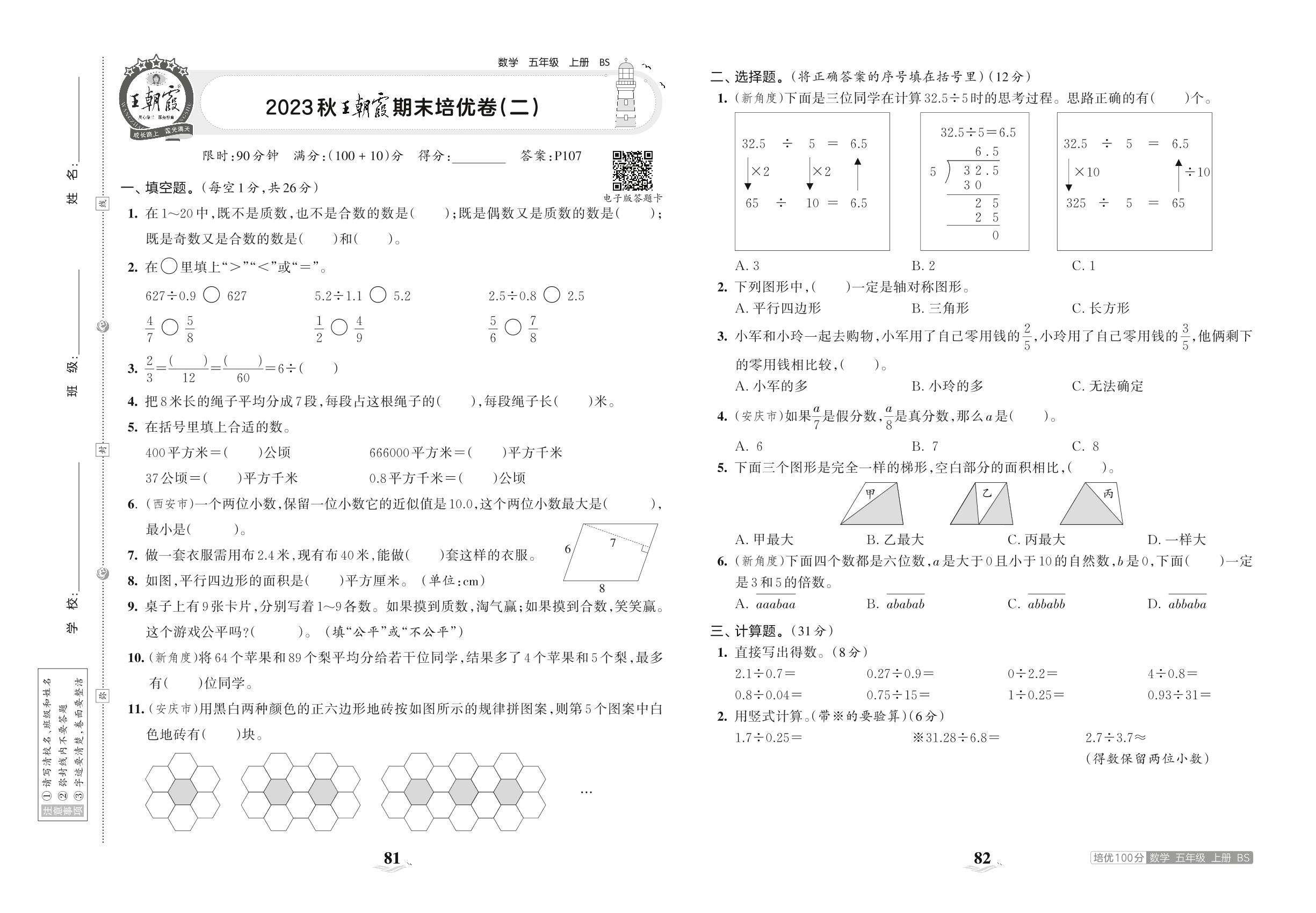 2023上册五年级数学北师版 2023秋王朝霞期末培优卷(二)