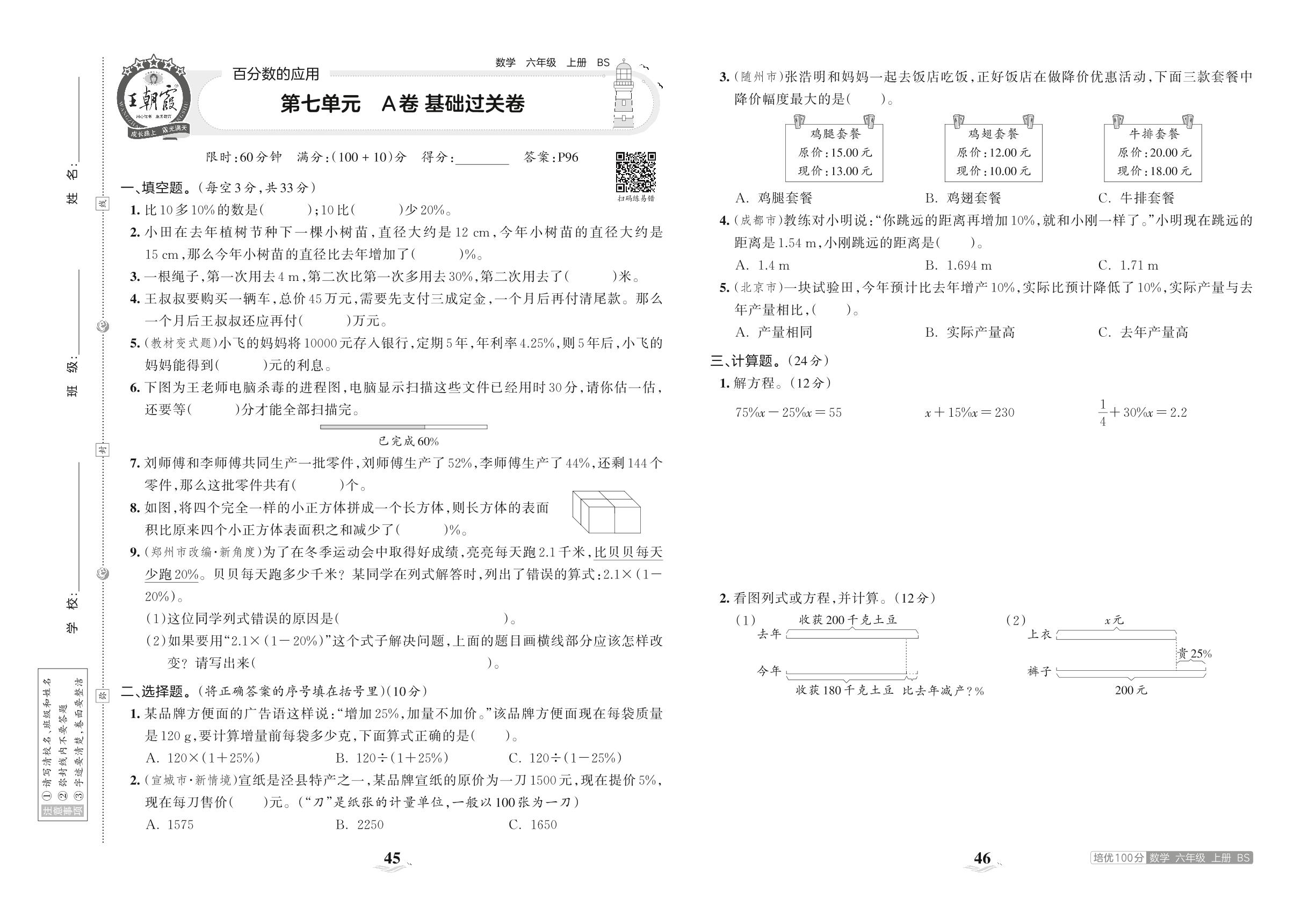 2023上册六年级数学北师版 第七单元 A卷 基础过关卷