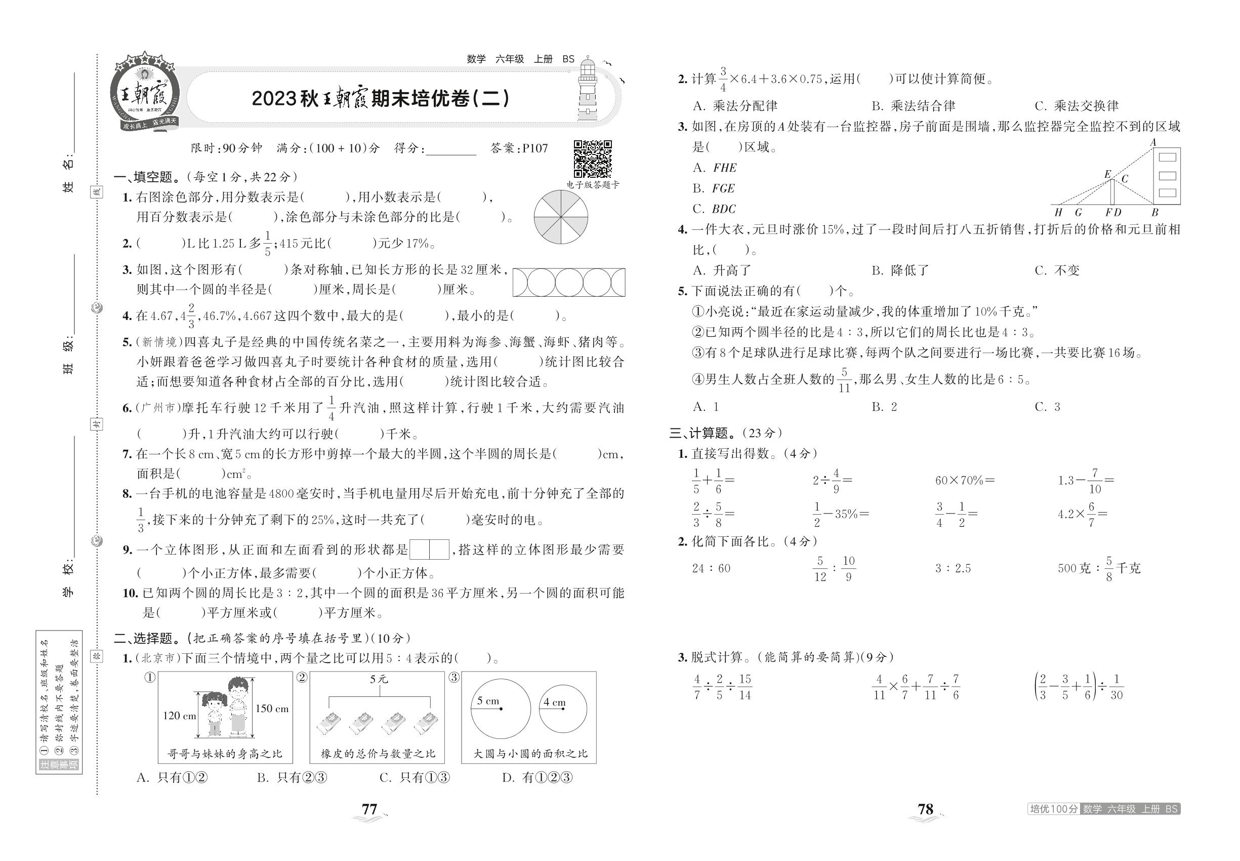 2023上册六年级数学北师版 2023秋王朝霞期末培优卷(二)