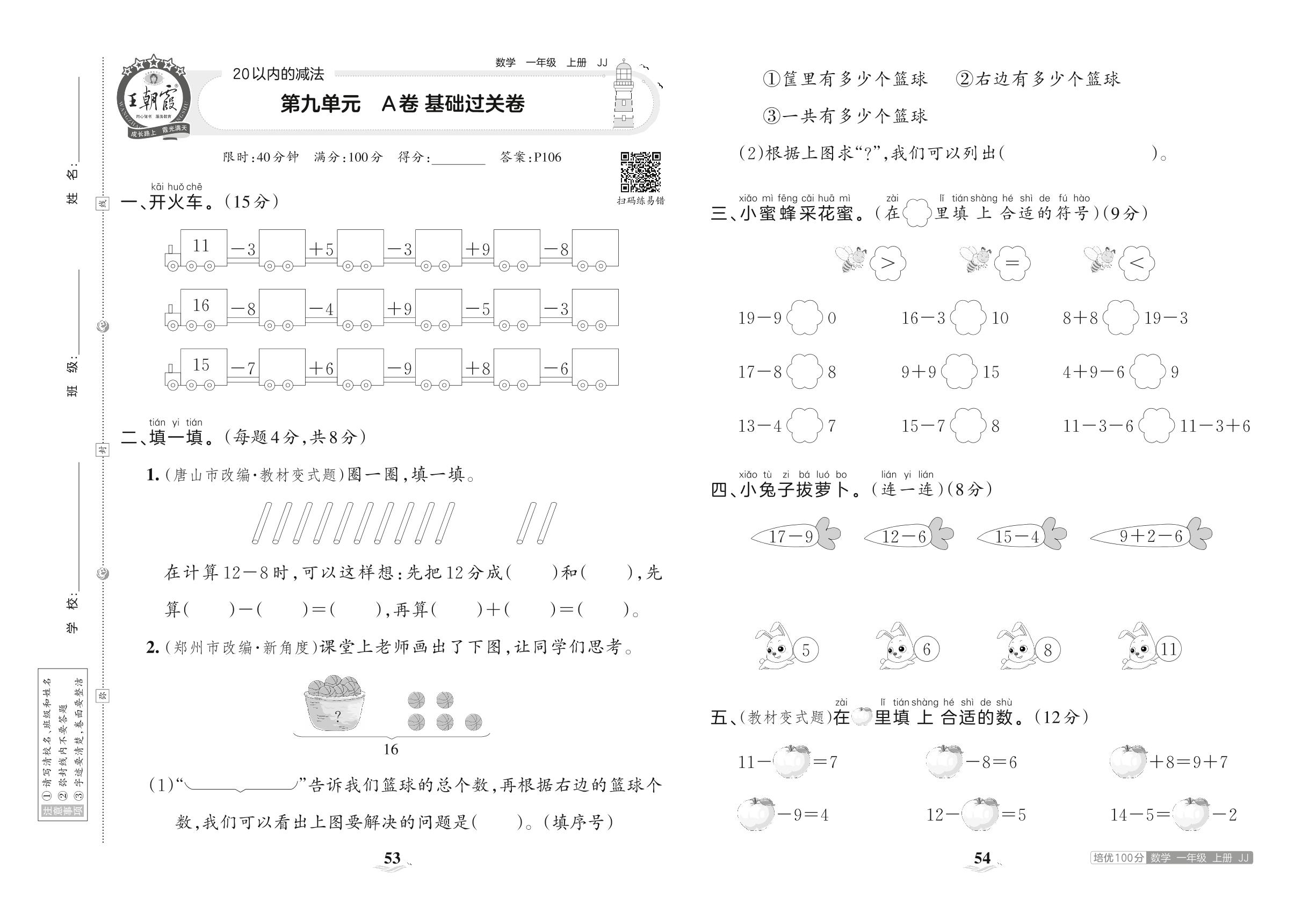 2023上册一年级数学冀教版 第九单元 A卷 基础过关卷