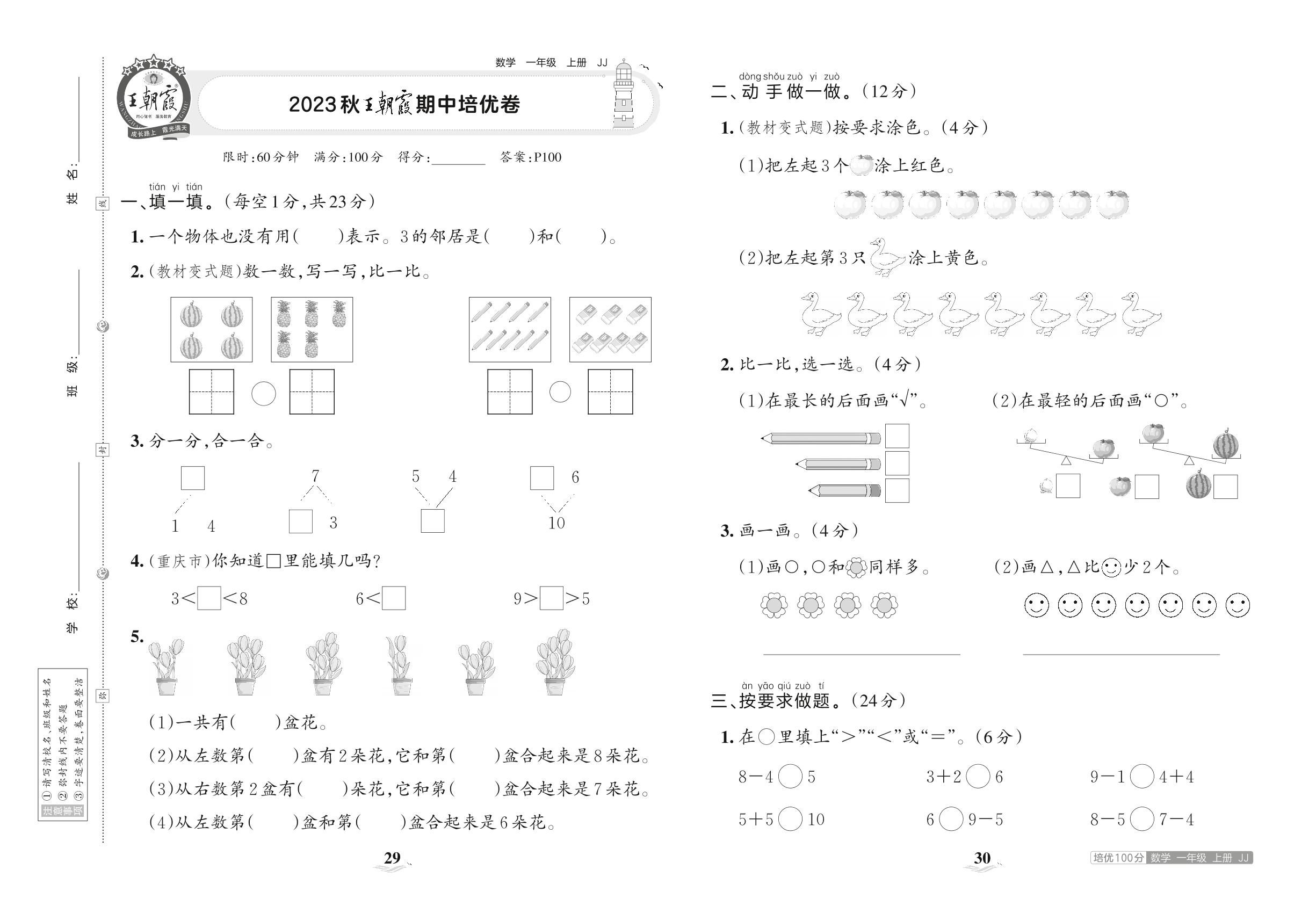 2023上册一年级数学冀教版 2023秋王朝霞期中培优卷
