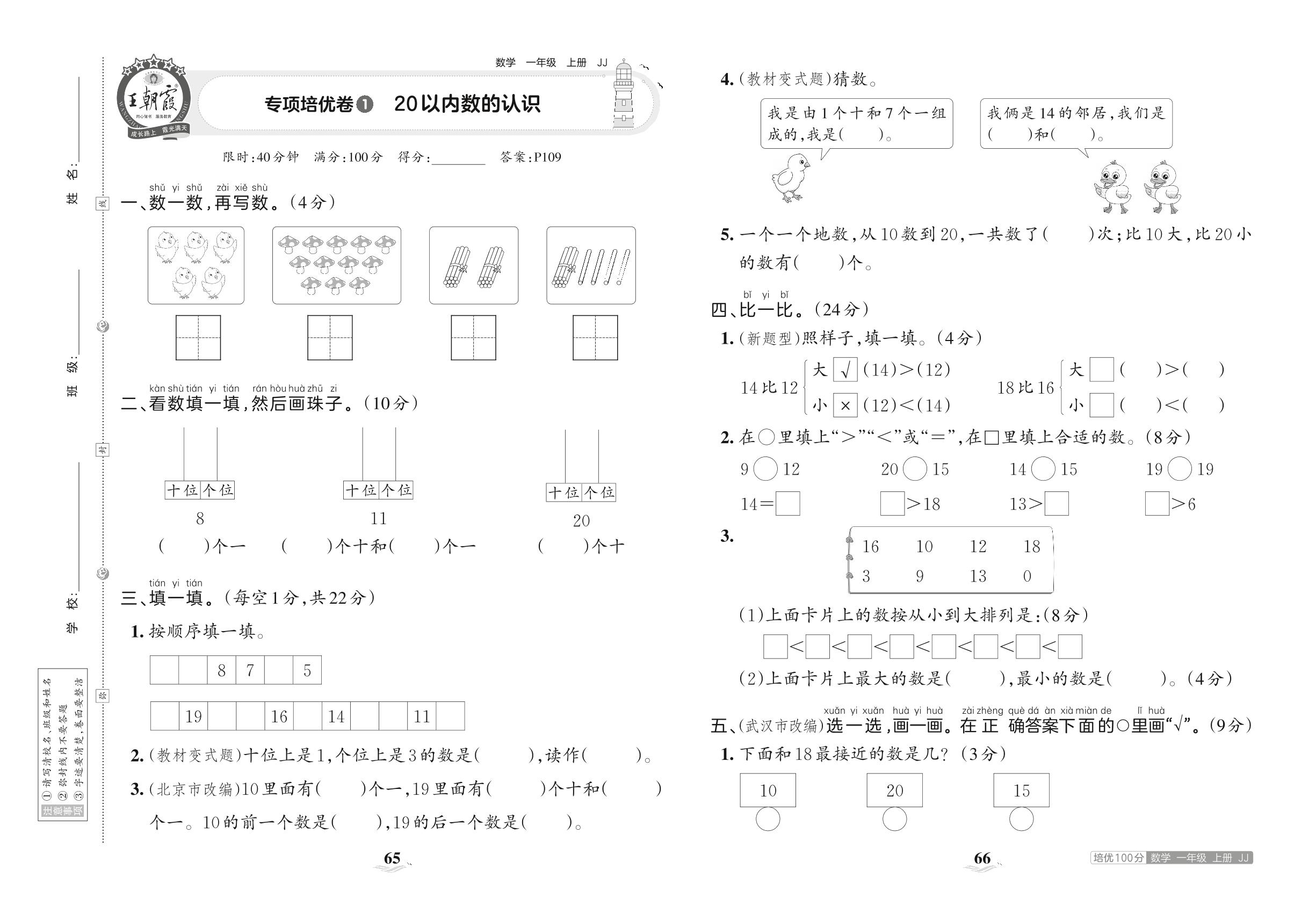 2023上册一年级数学冀教版 专项培优卷1 20以内数的认识