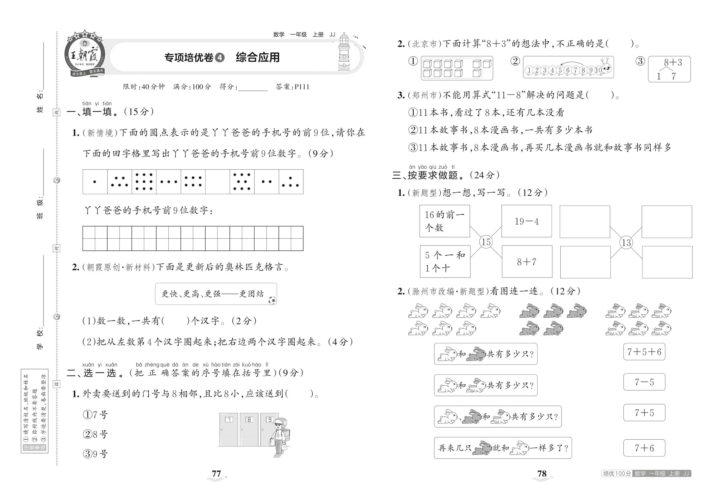 2023上册一年级数学冀教版 专项培优卷4 综合应用