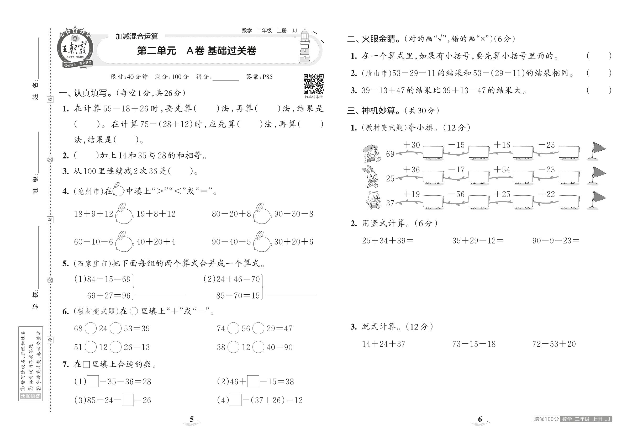 2023上册二年级数学冀教版 第二单元 A卷 基础过关卷