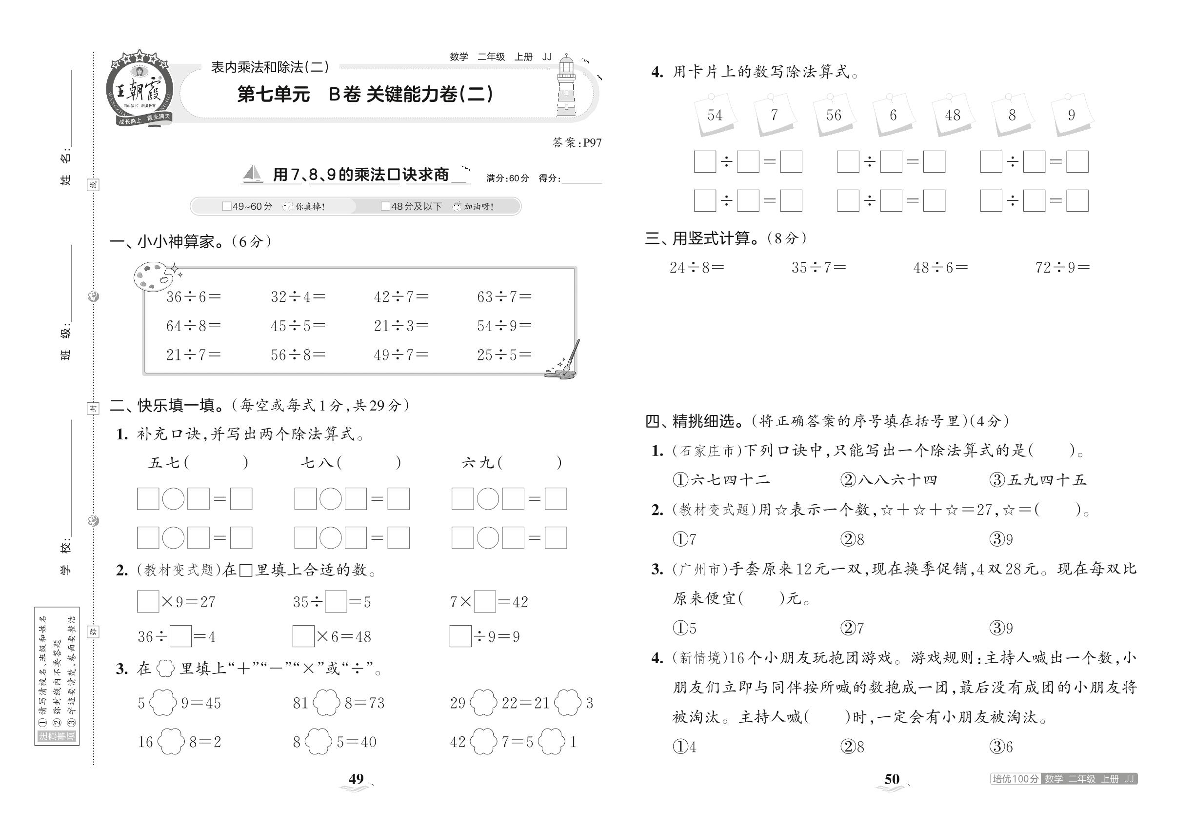 2023上册二年级数学冀教版 第七单元 B卷 关键能力卷(二)