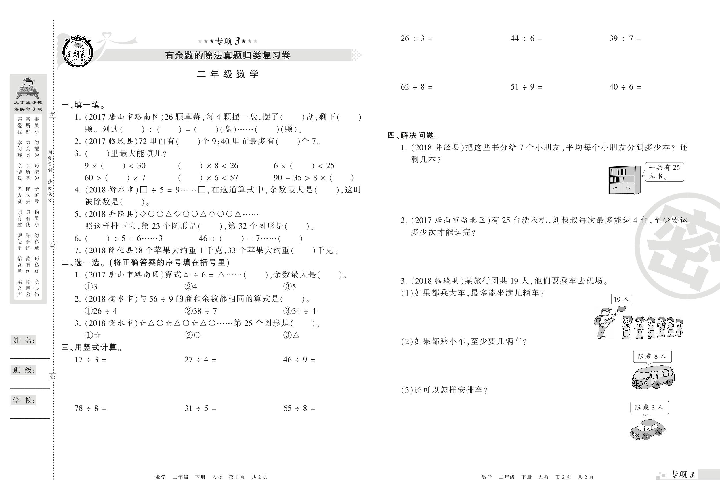 王朝霞期末专项卷——有余数的除法、万以内数的认识真题归类复习卷二年级下册数学(人教版)_R21080393639【0】