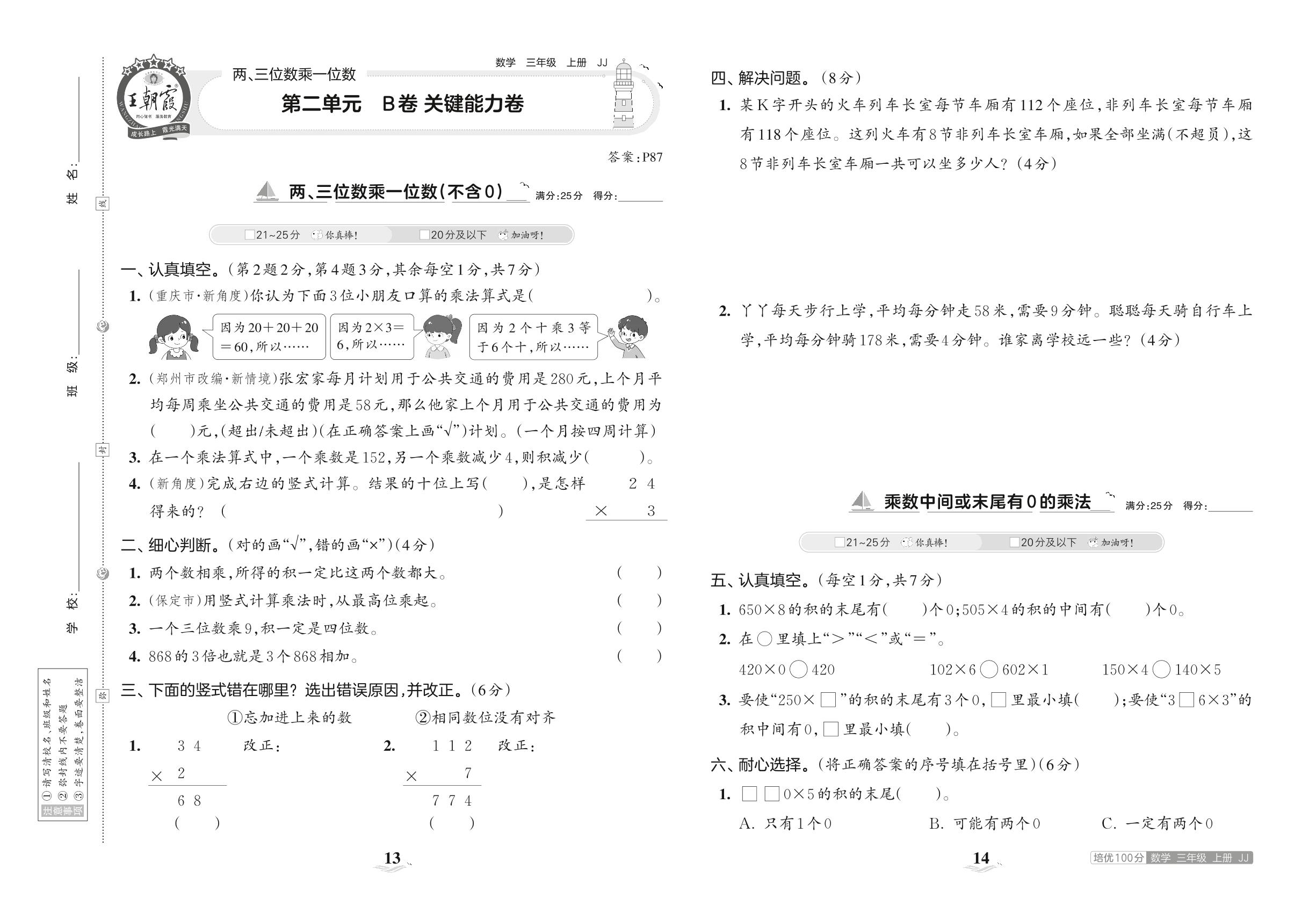 2023上册三年级数学冀教版 第二单元 B卷 关键能力卷