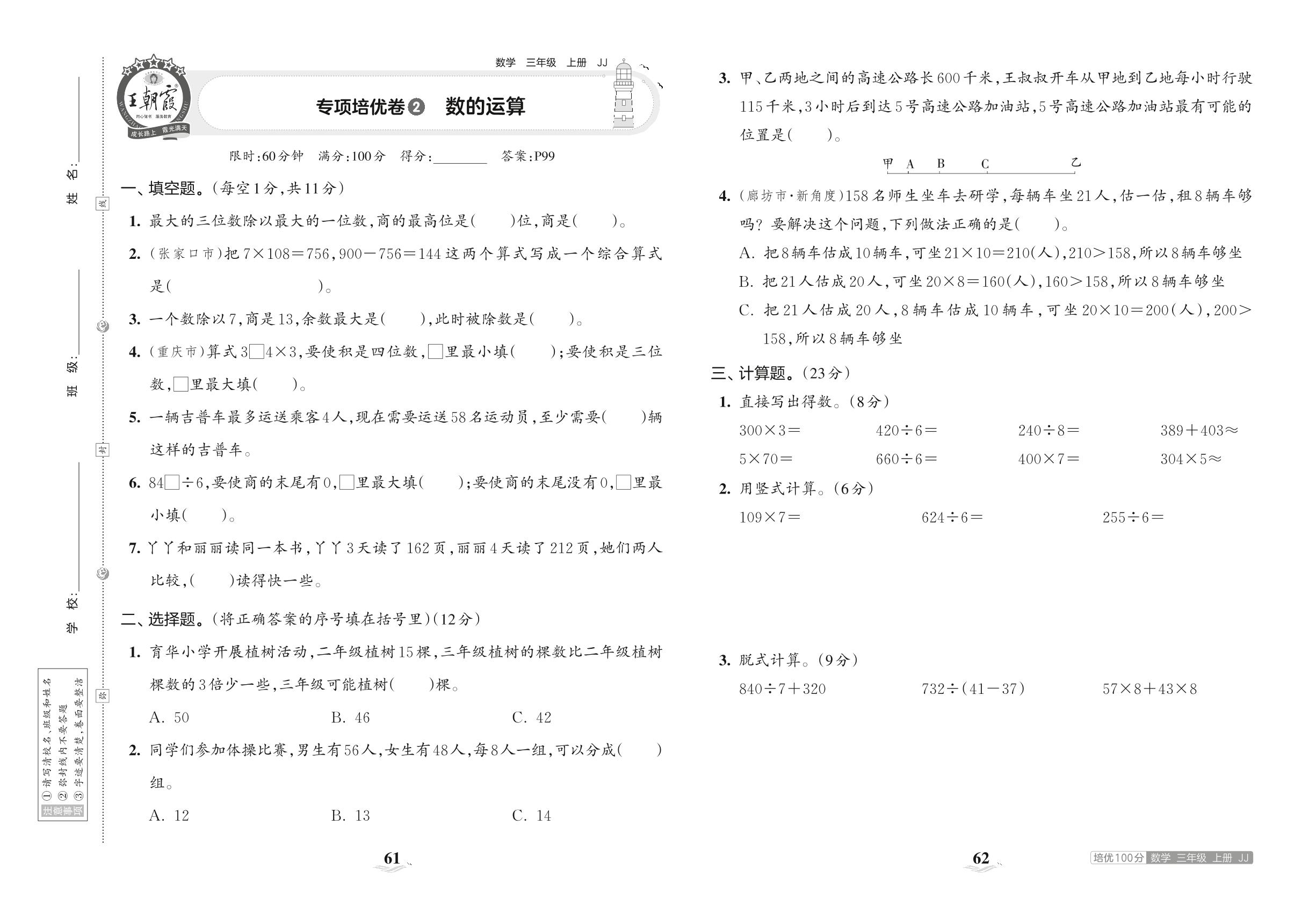 2023上册三年级数学冀教版 专项培优卷2 数的运算