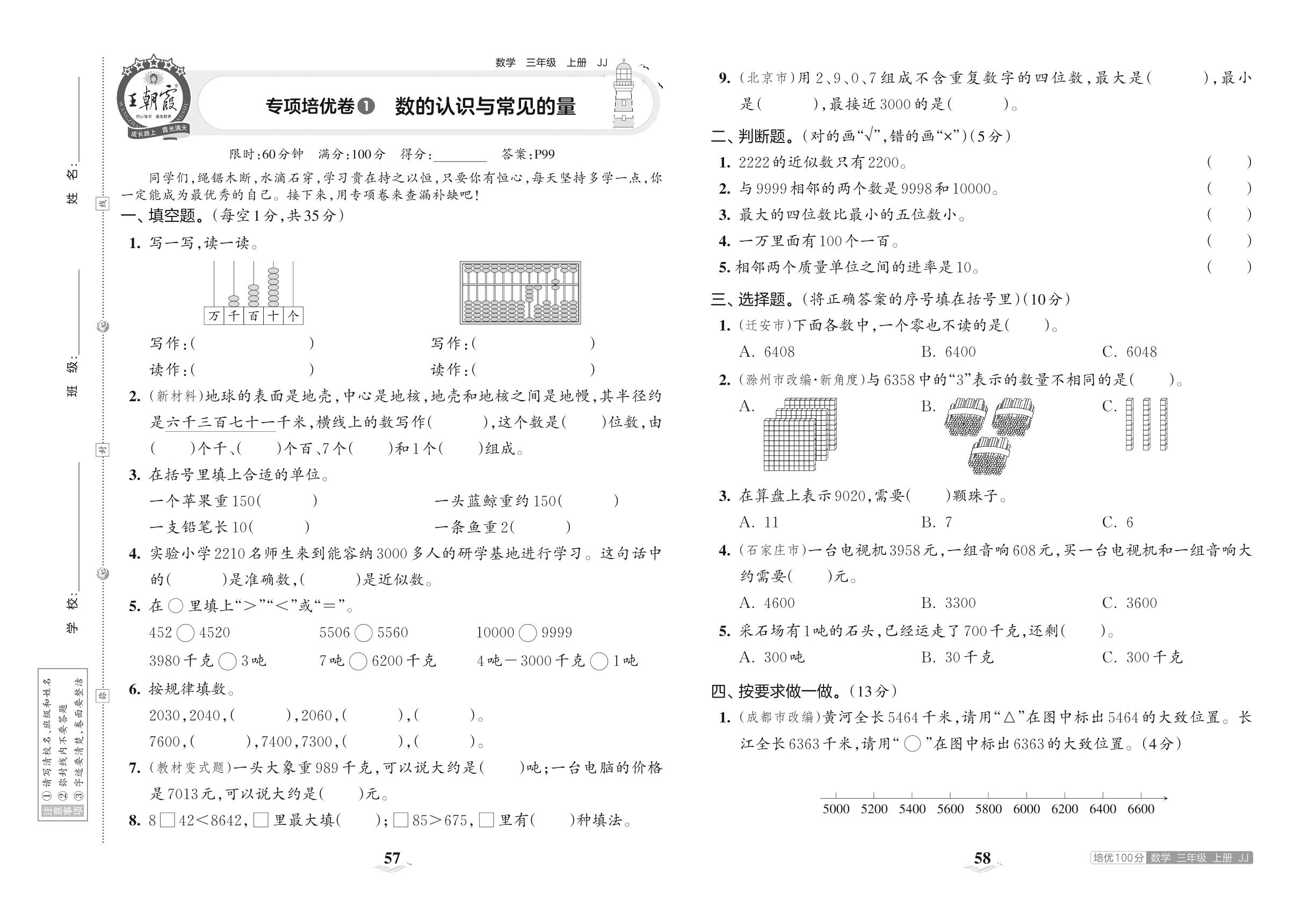 2023上册三年级数学冀教版 专项培优卷1 数的认识与常见的量