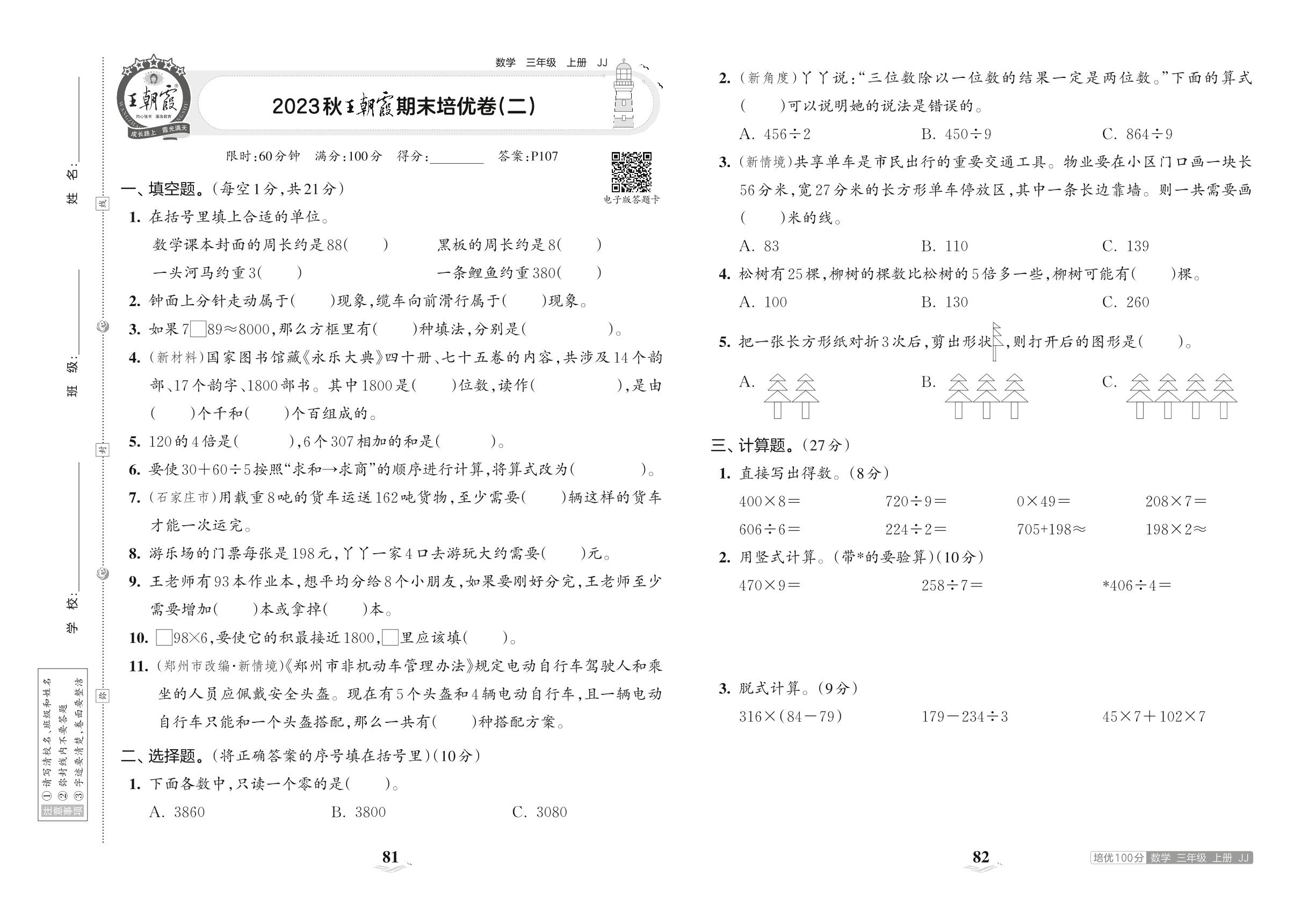 2023上册三年级数学冀教版 2023秋王朝霞期末培优卷(二)