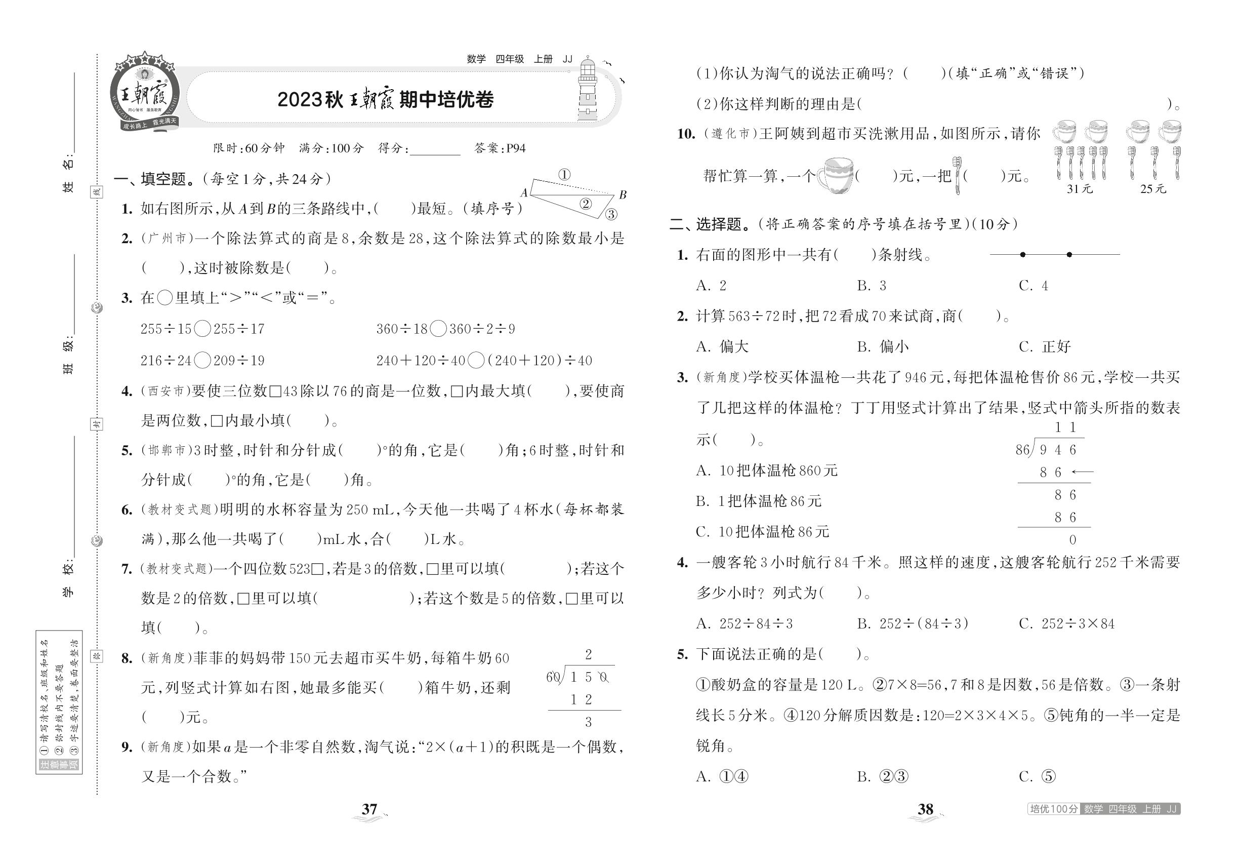 2023上册四年级数学冀教版 2023秋王朝霞期中培优卷