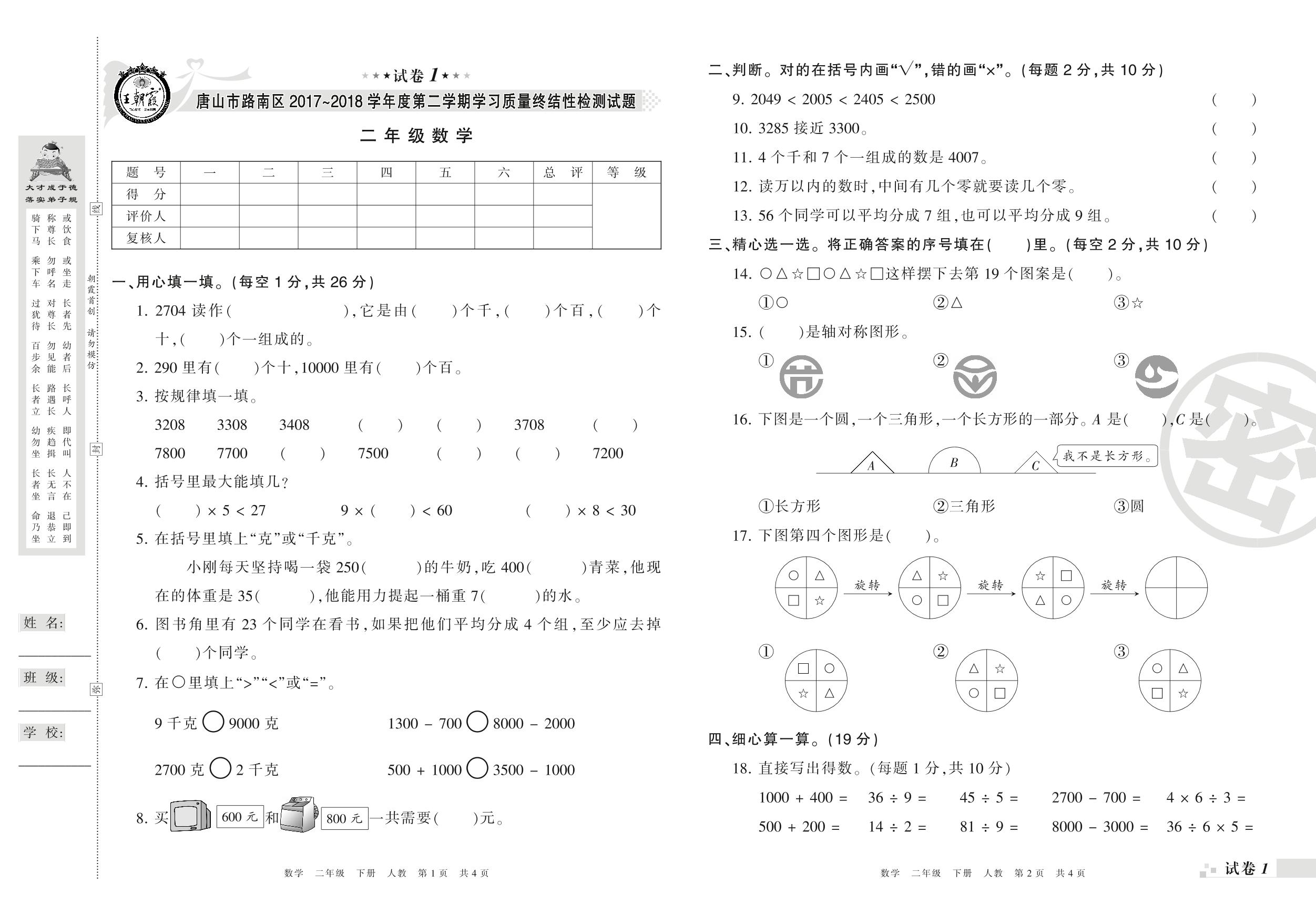 2017-2018学年第二学期唐山市路南区二年级数学试卷(人教版)【1】