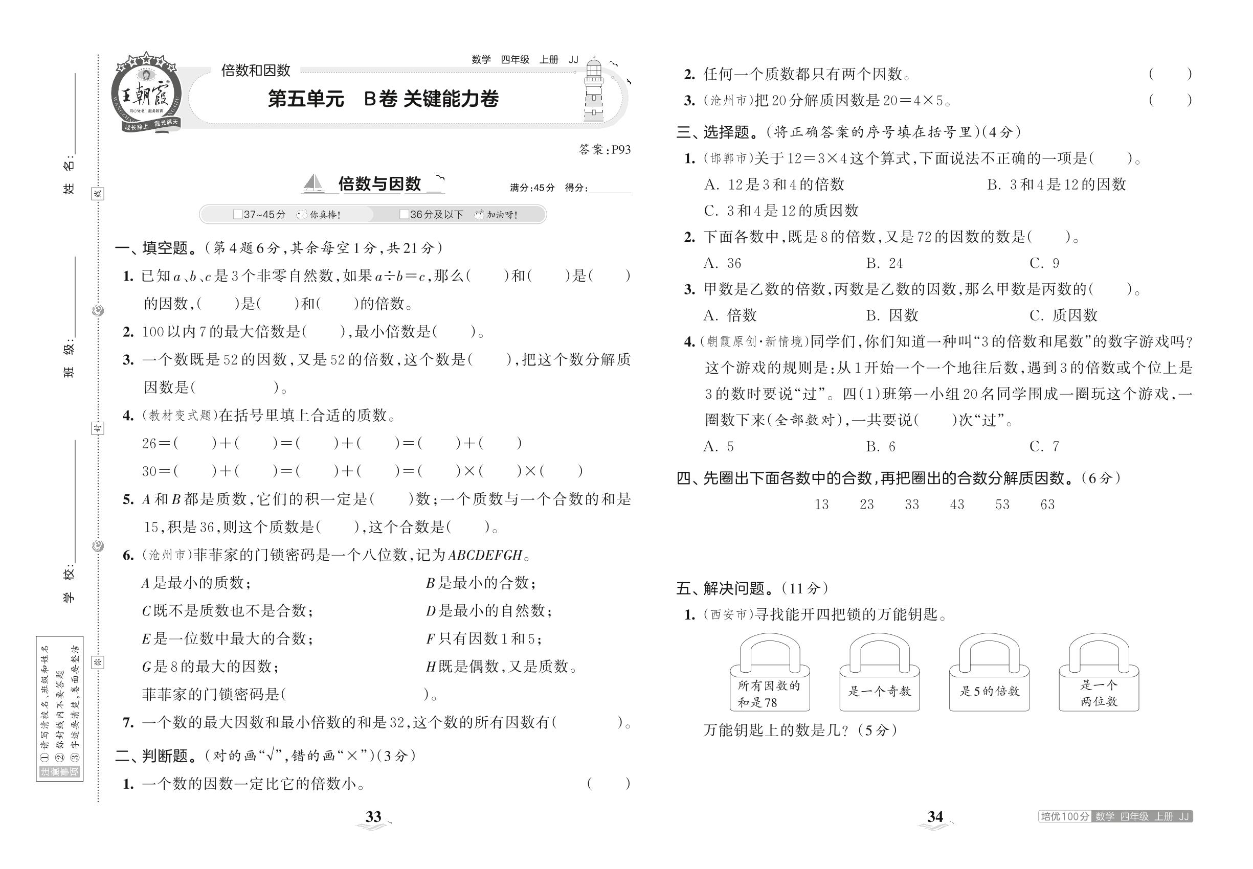 2023上册四年级数学冀教版 第五单元 B卷 关键能力卷
