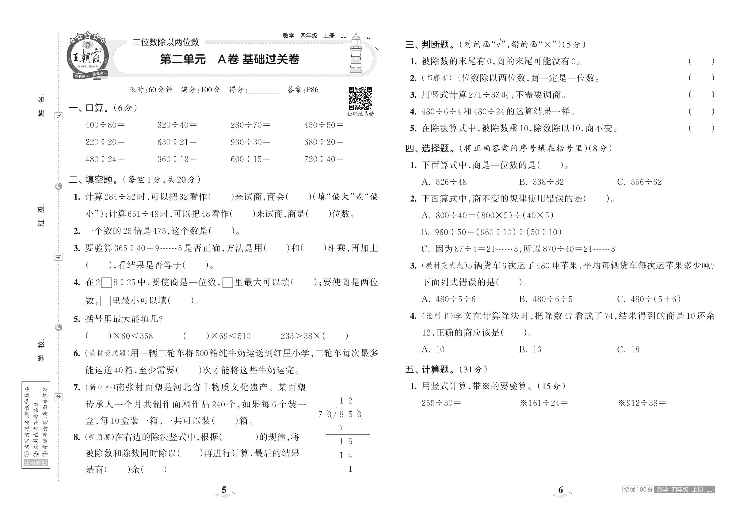 2023上册四年级数学冀教版 第二单元 A卷 基础过关卷
