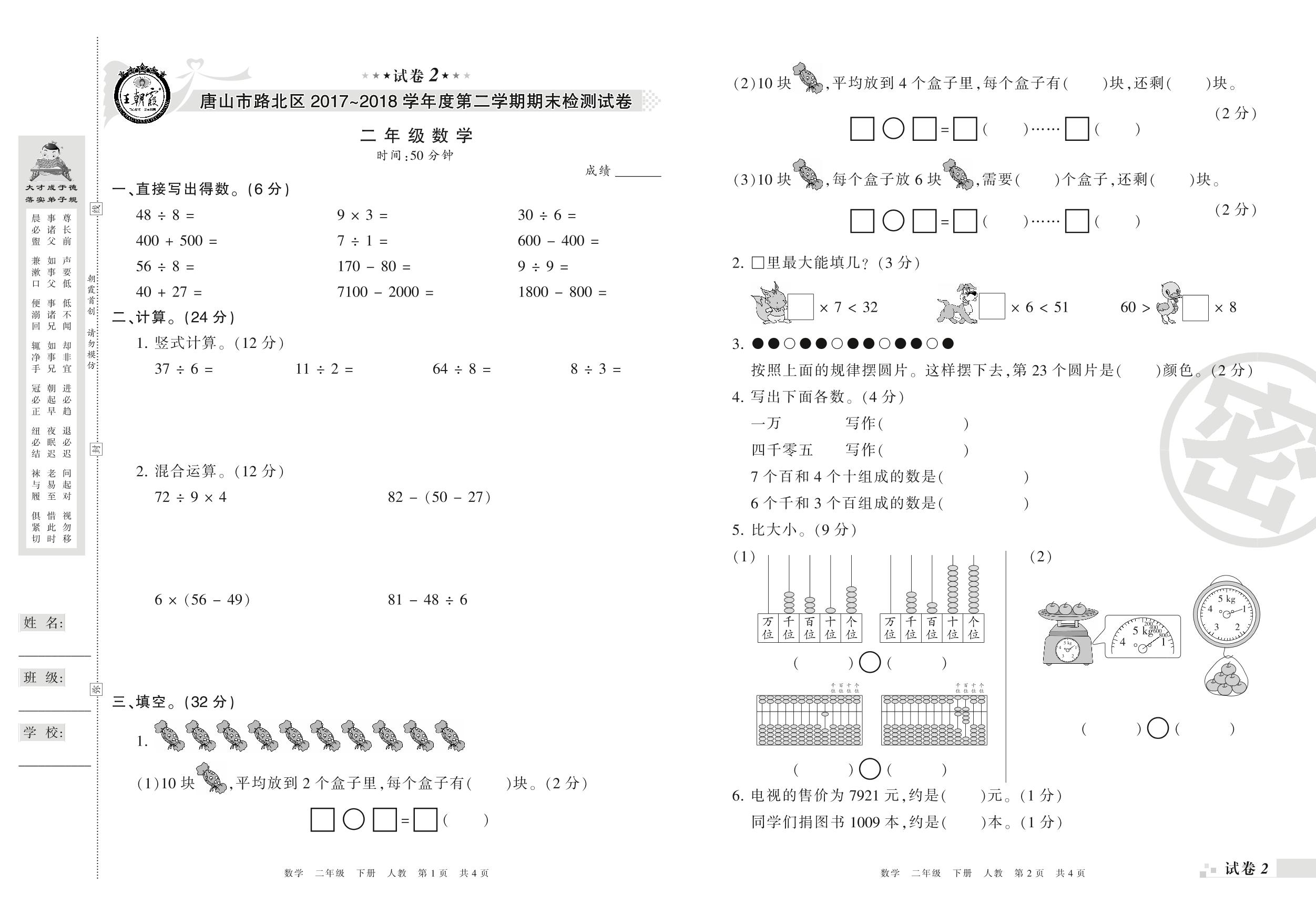 2017-2018学年第二学期唐山市路北区二年级数学试卷(人教版)【2】