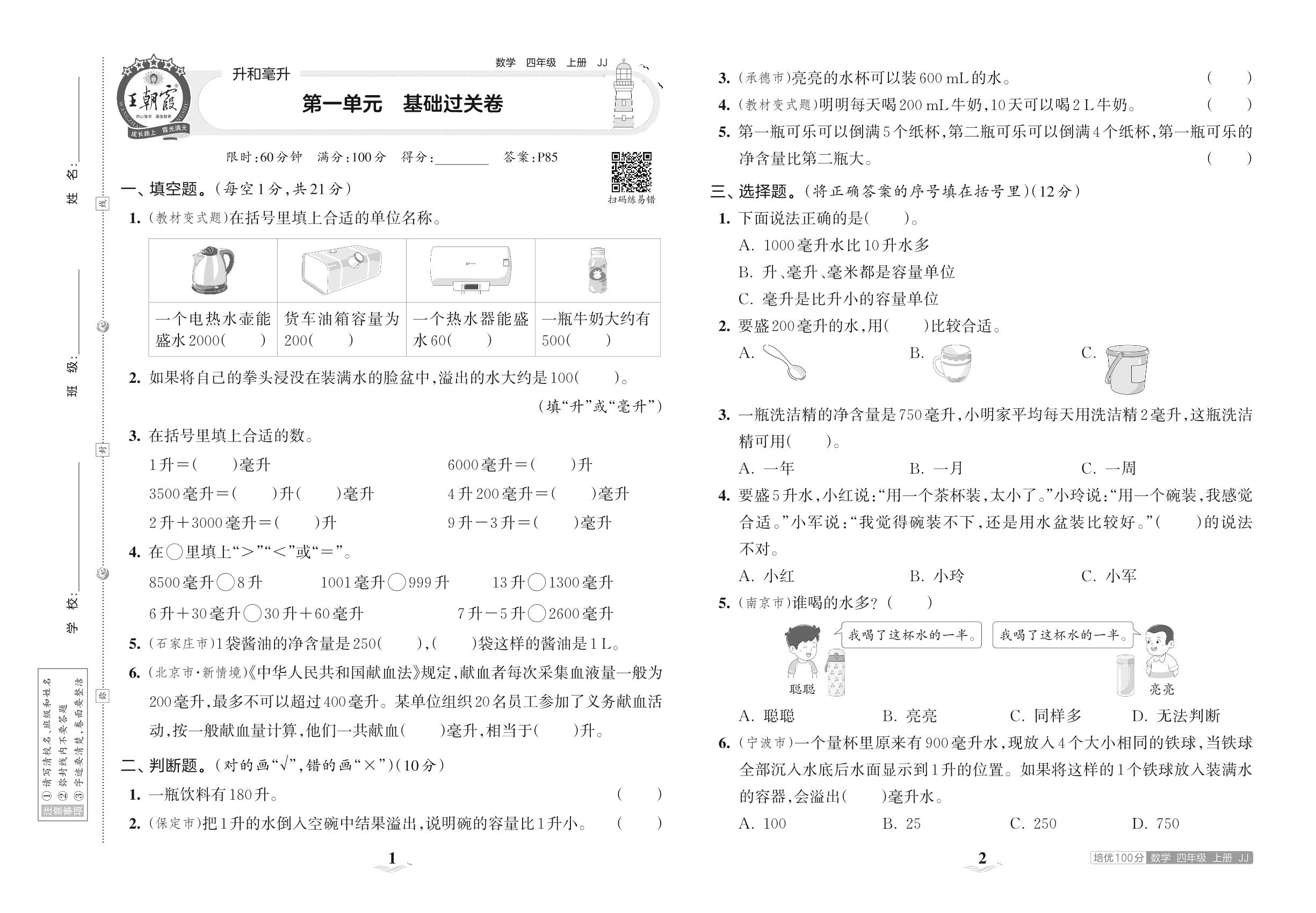 四年级数学冀教版上册单元卷