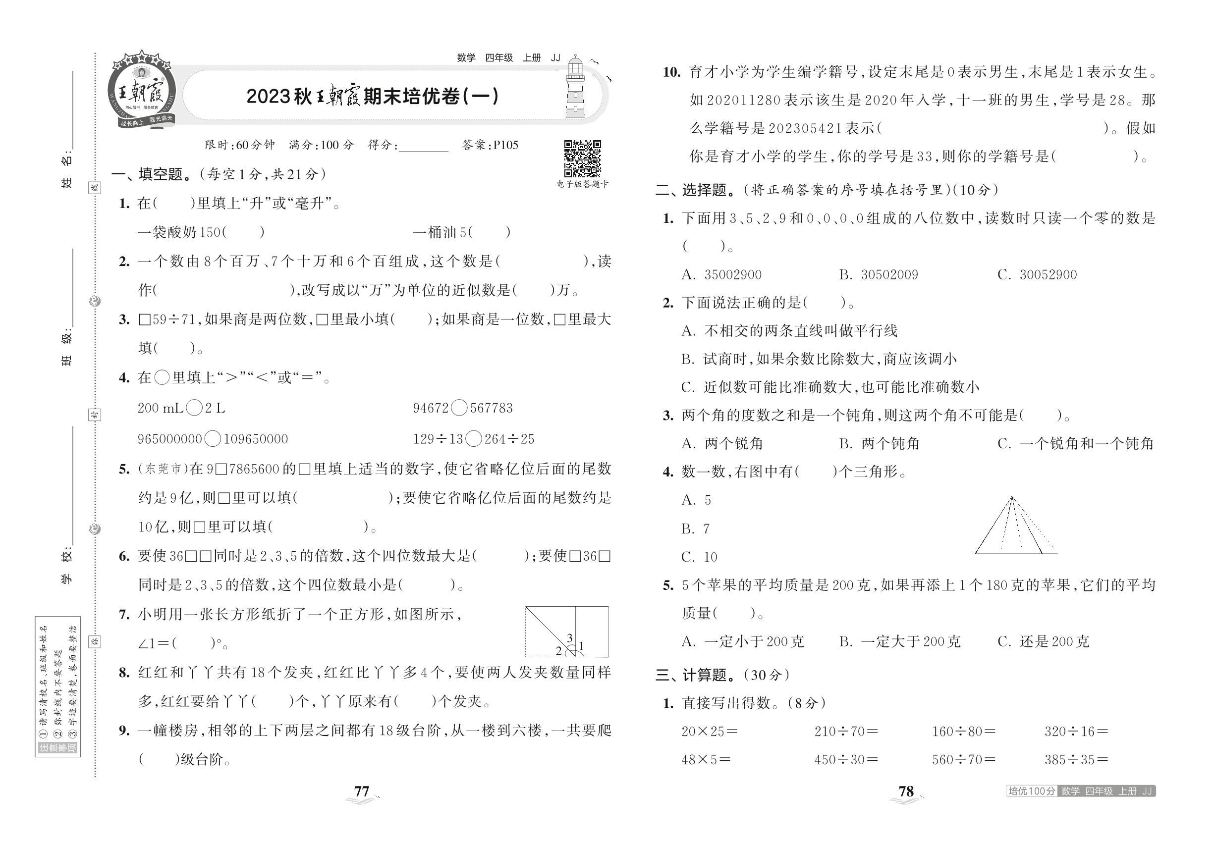 2023上册四年级数学冀教版 2023秋王朝霞期末培优卷(一)