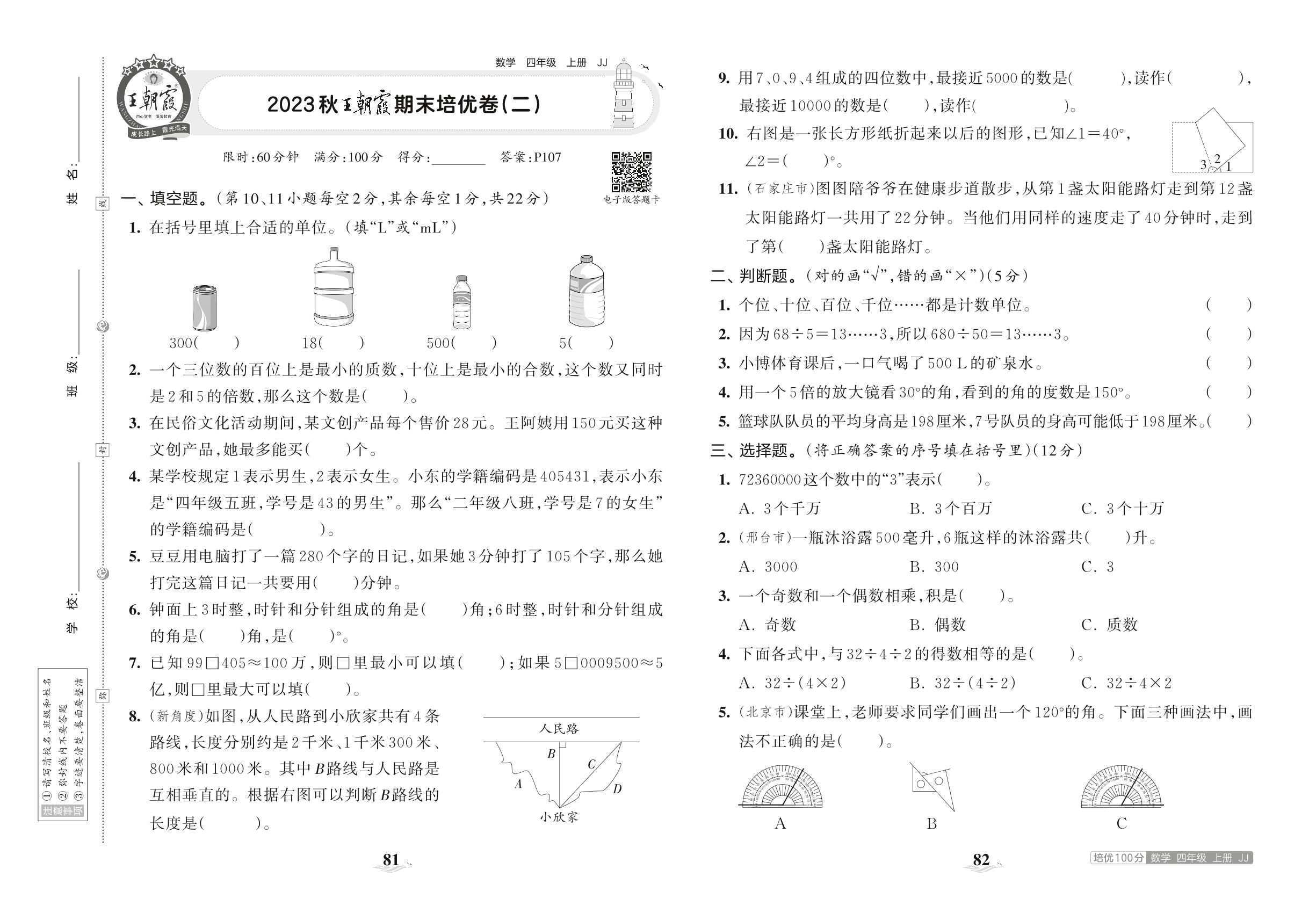 2023上册四年级数学冀教版 2023秋王朝霞期末培优卷(二)