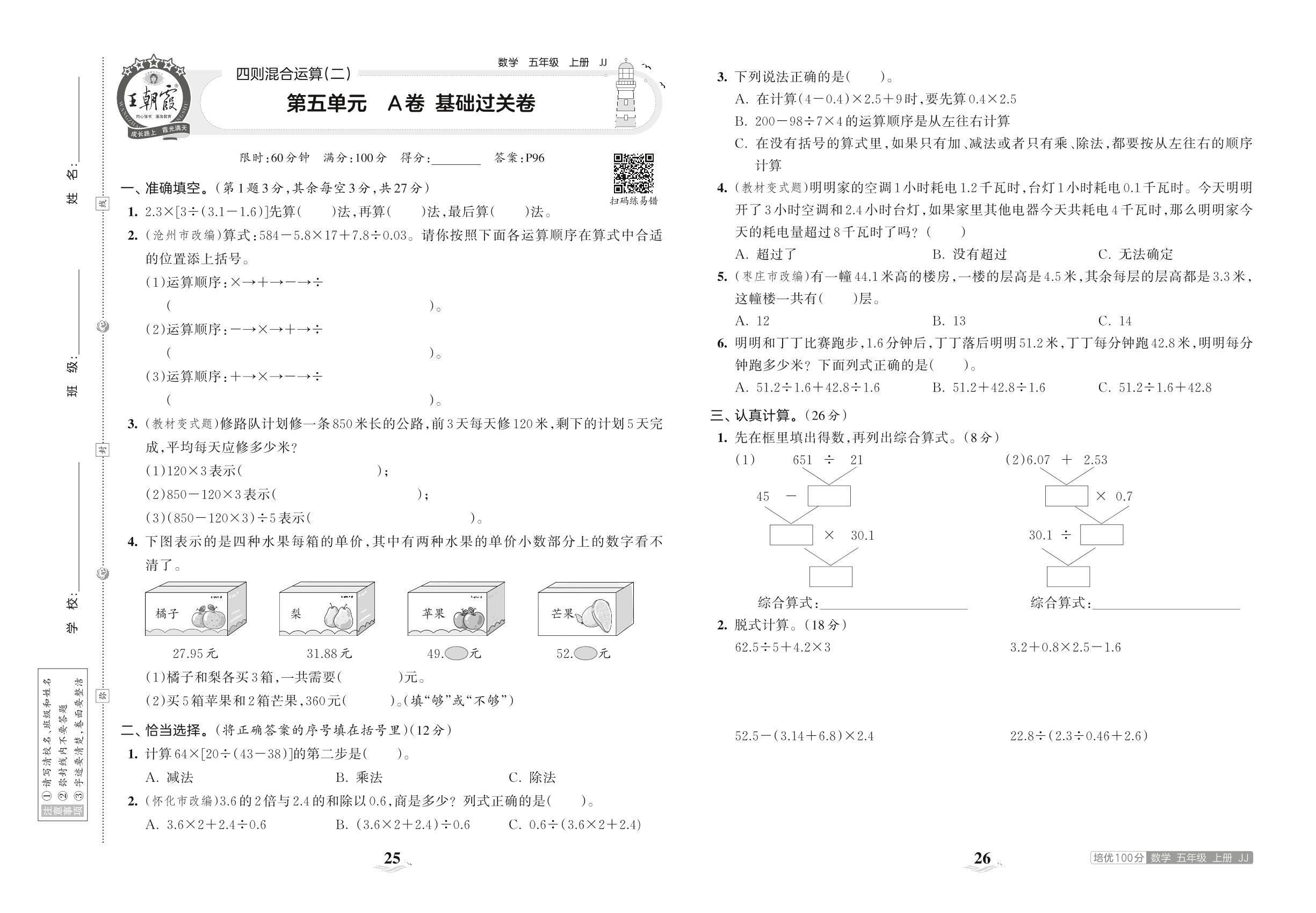 2023上册五年级数学冀教版 第五单元 A卷 基础过关卷