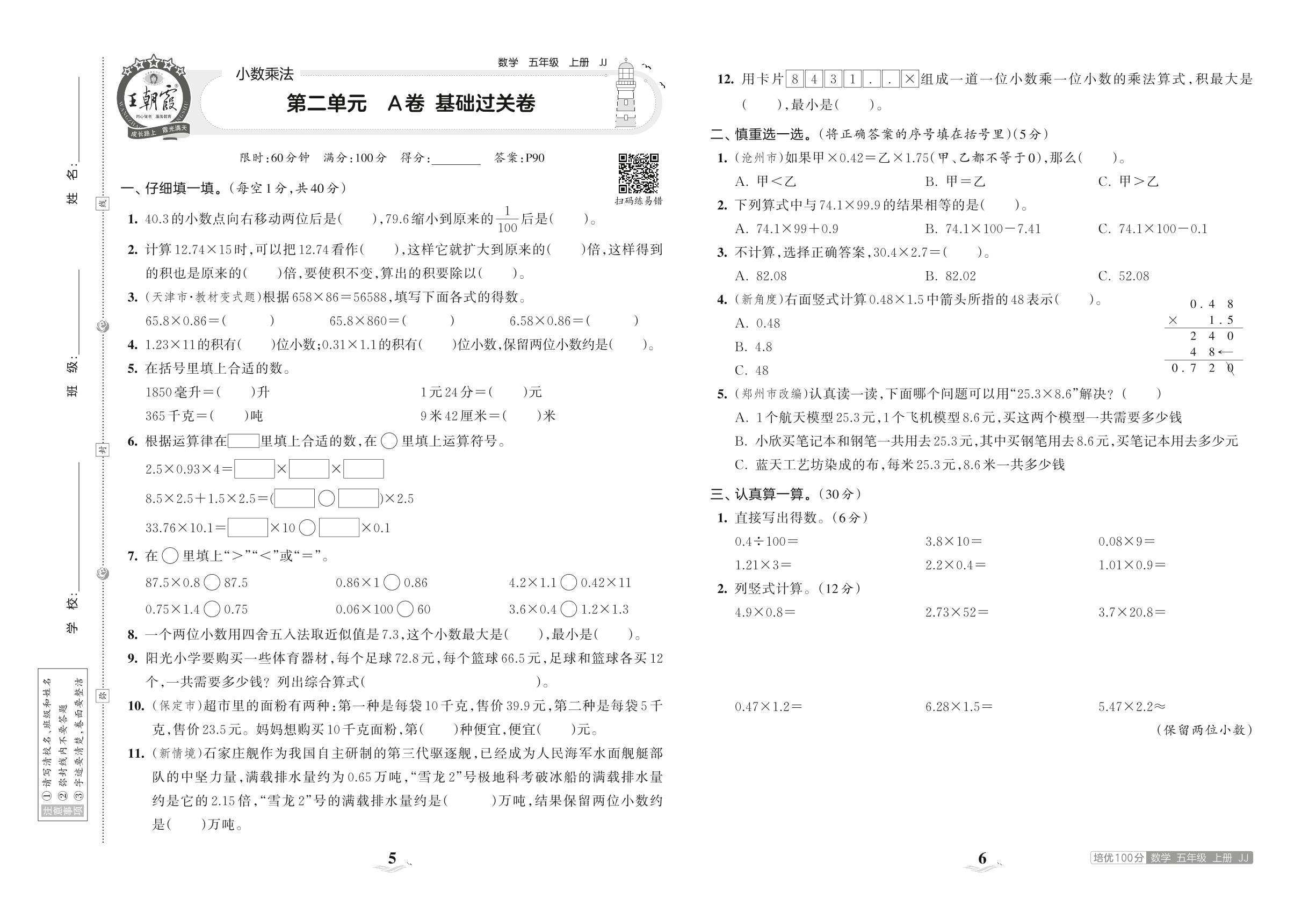 2023上册五年级数学冀教版 第二单元 A卷 基础过关卷