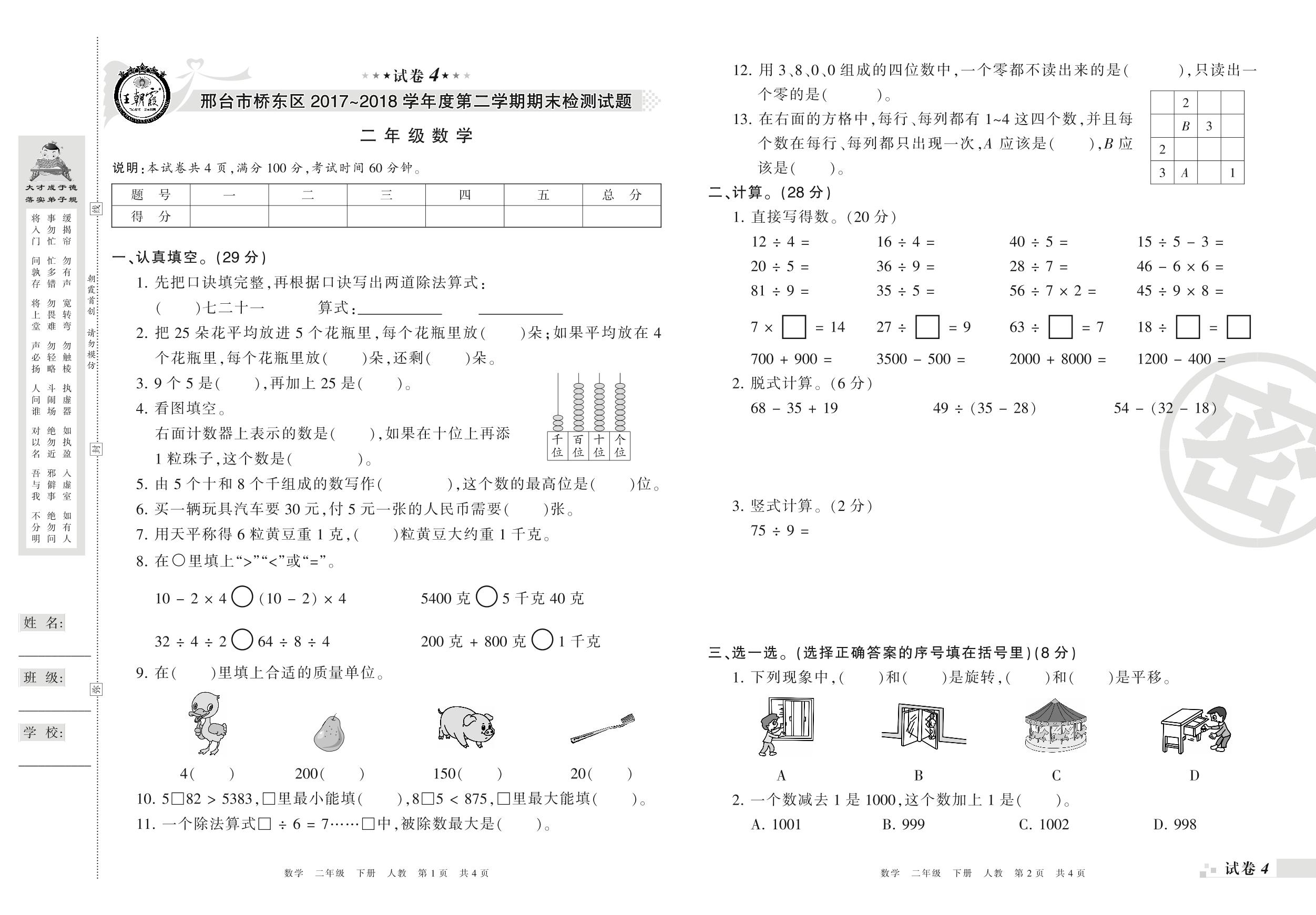 2017-2018学年第二学期邢台市桥东区二年级数学试卷(人教版)【4】