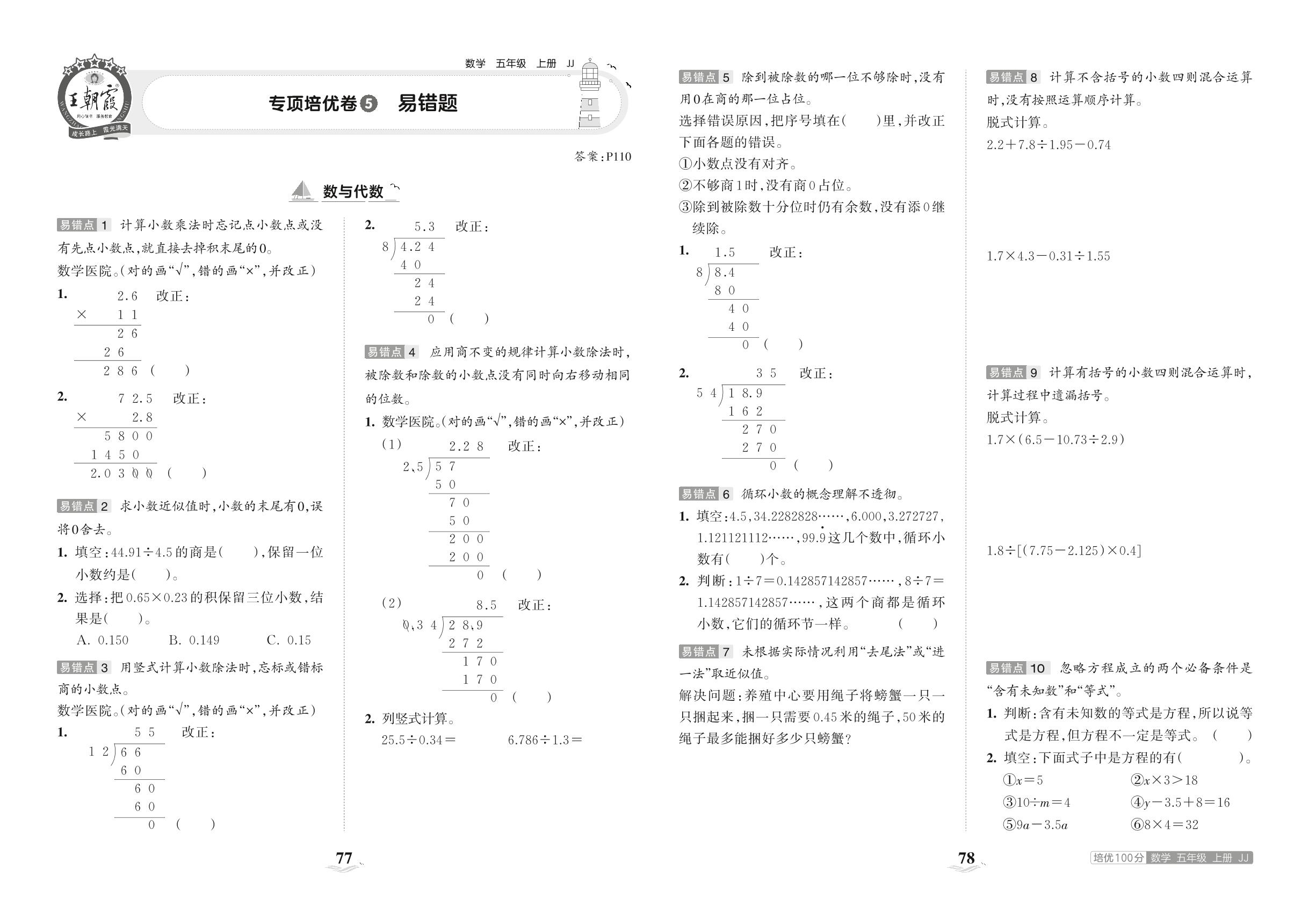 2023上册五年级数学冀教版 专项培优卷5 易错题